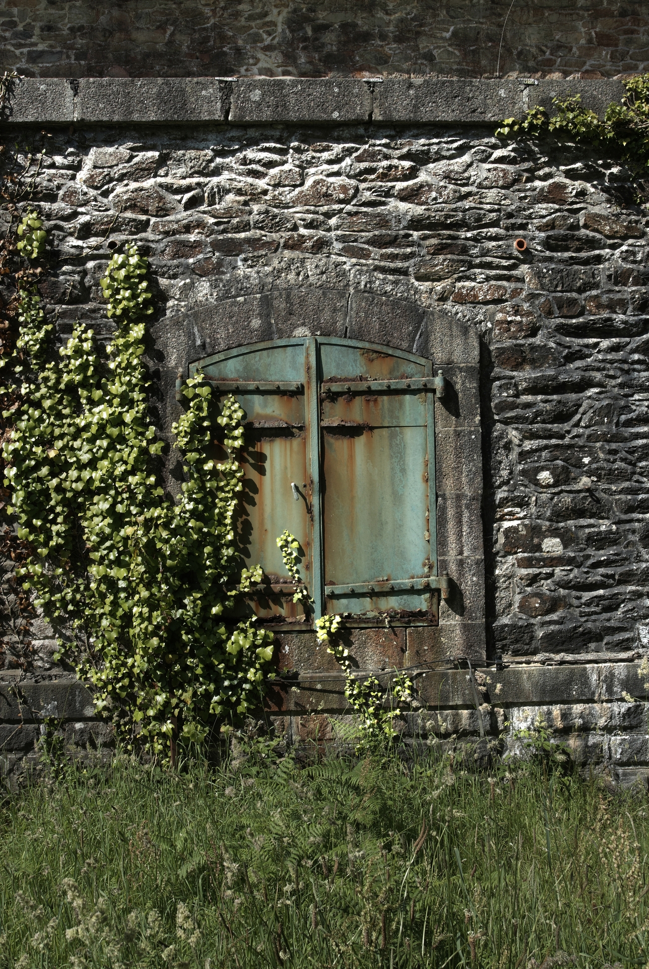 Vue de l'un des magasins à poudre de la vallée de Kerhuon à Guipavas : sas d'entrée, détail d'une fenêtre ayant conservé ses vantaux (état en 2009)Immatriculation