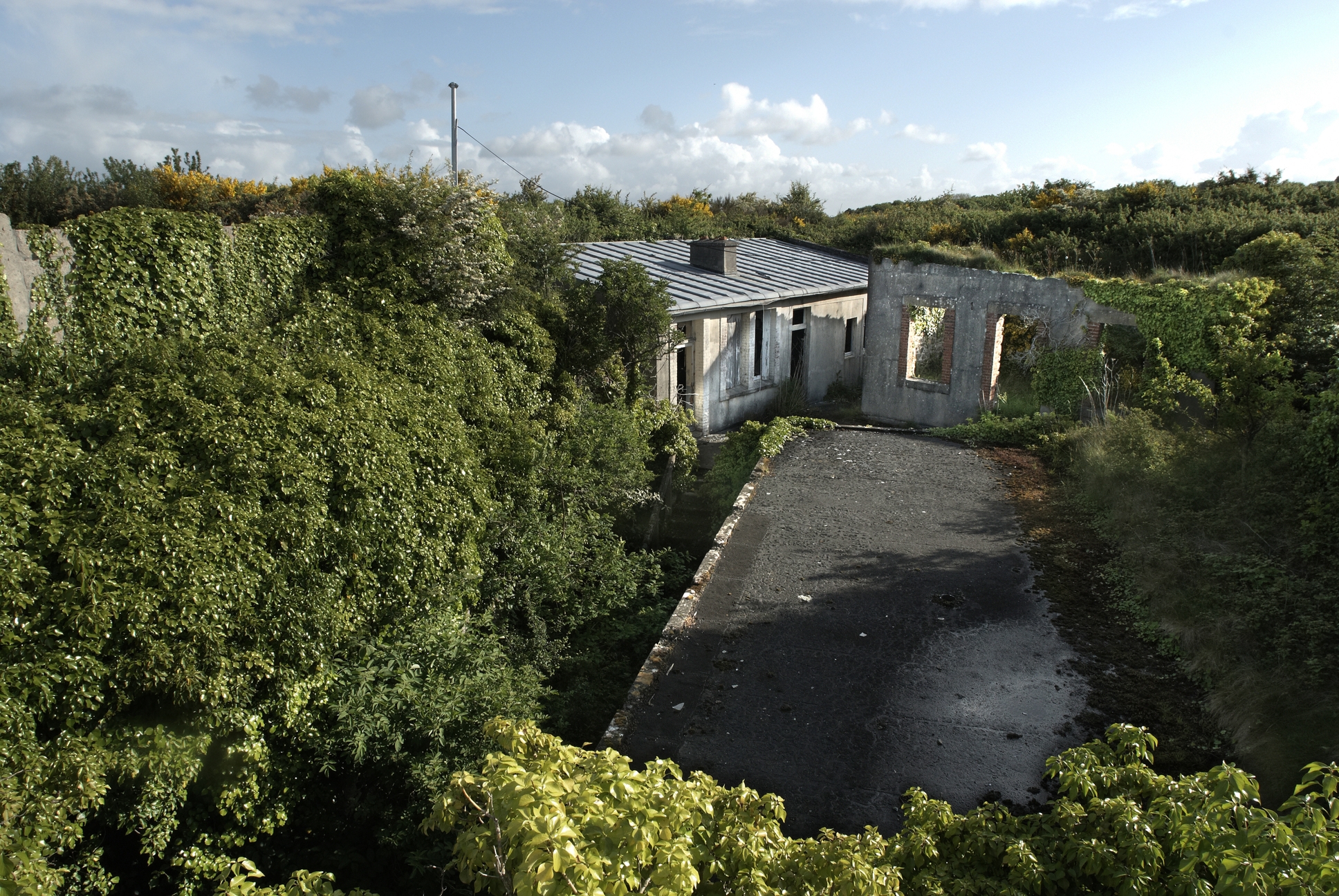 Vue générale des bâtiments implantés dans/sur la redoute (état en 2009). Au premier plan, la dalle de couverture de l'usine électrique du poste photo-électrique. La végétation a repris possession des lieuxImmatriculation