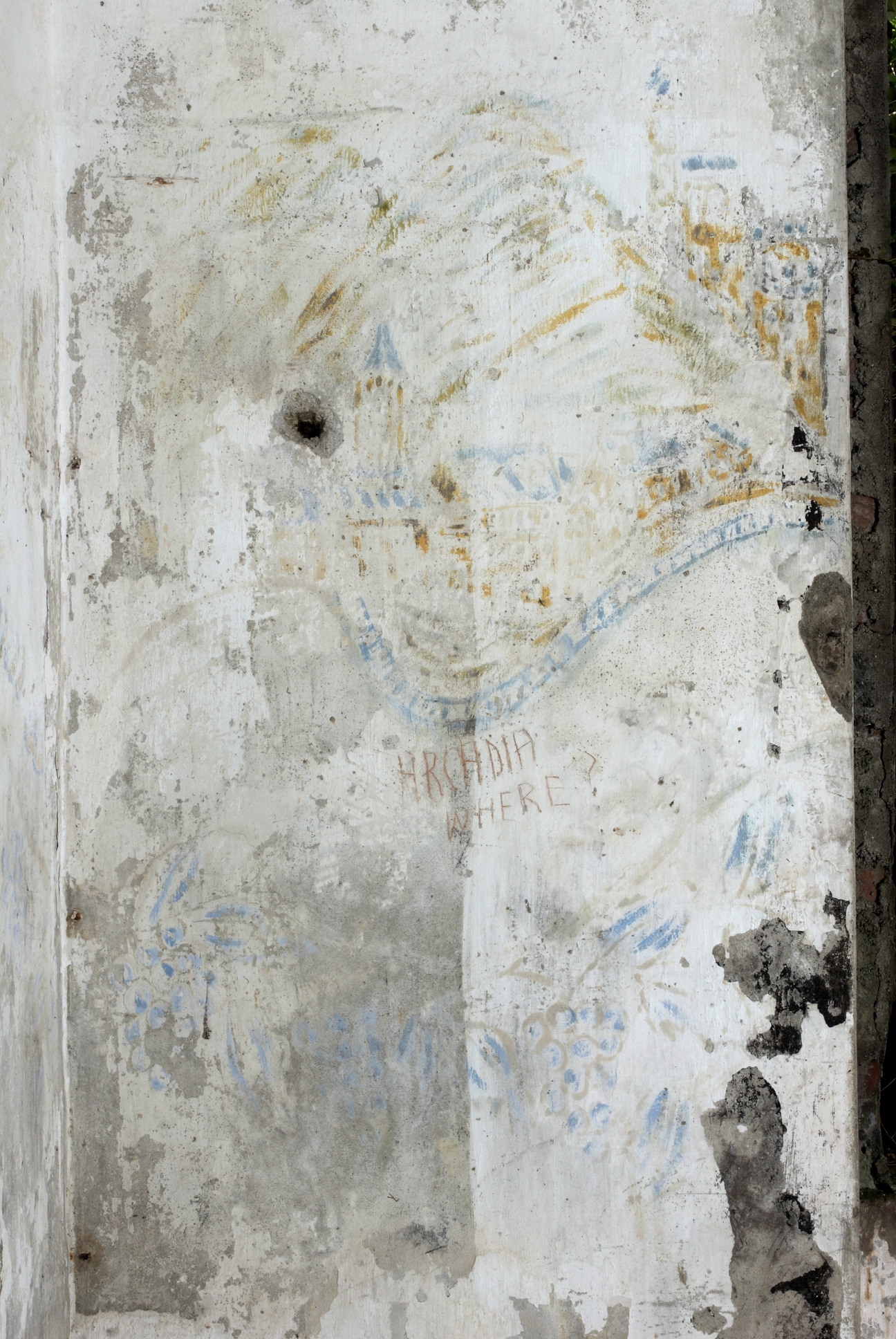 Vue de l'intérieur de l'usine électrique du poste photo-électrique : sous les graffitis récents, traces de peintures murales allemandes témoignant de l'utilisation de cette pièce (état en 2009)Immatriculation
