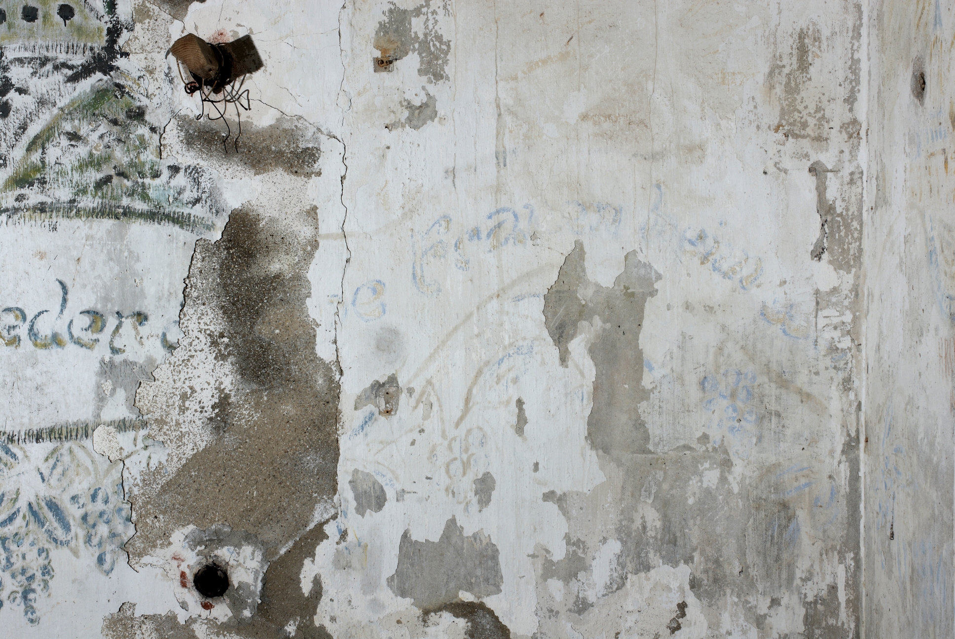 Vue de l'intérieur de l'usine électrique du poste photo-électrique : sous les graffitis récents, traces de peintures murales allemandes témoignant de l'utilisation de cette pièce (état en 2009)Immatriculation
