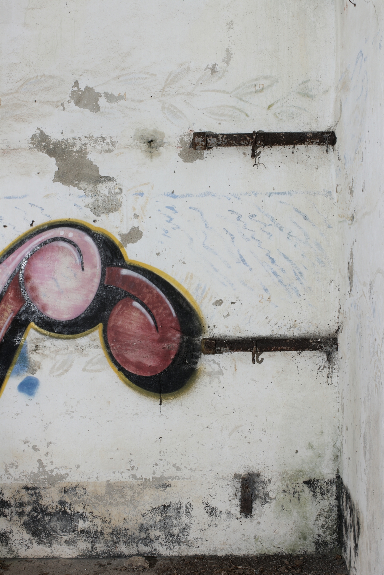 Vue de l'intérieur de l'usine électrique du poste photo-électrique : sous les graffitis récents, traces de peintures murales allemandes témoignant de l'utilisation de cette pièce (état en 2009)Immatriculation