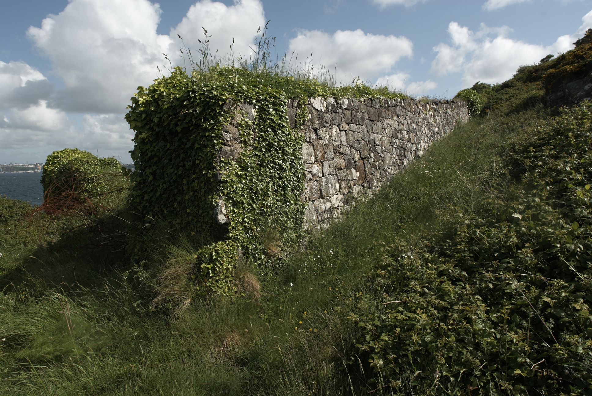 Vue de l'extrémité de la branche tombante nord (état en 2009) : elle protège le chemin d'accès à la partie haute du fort (redoute, batterie d'artillerie pour mortier et caserne)Immatriculation