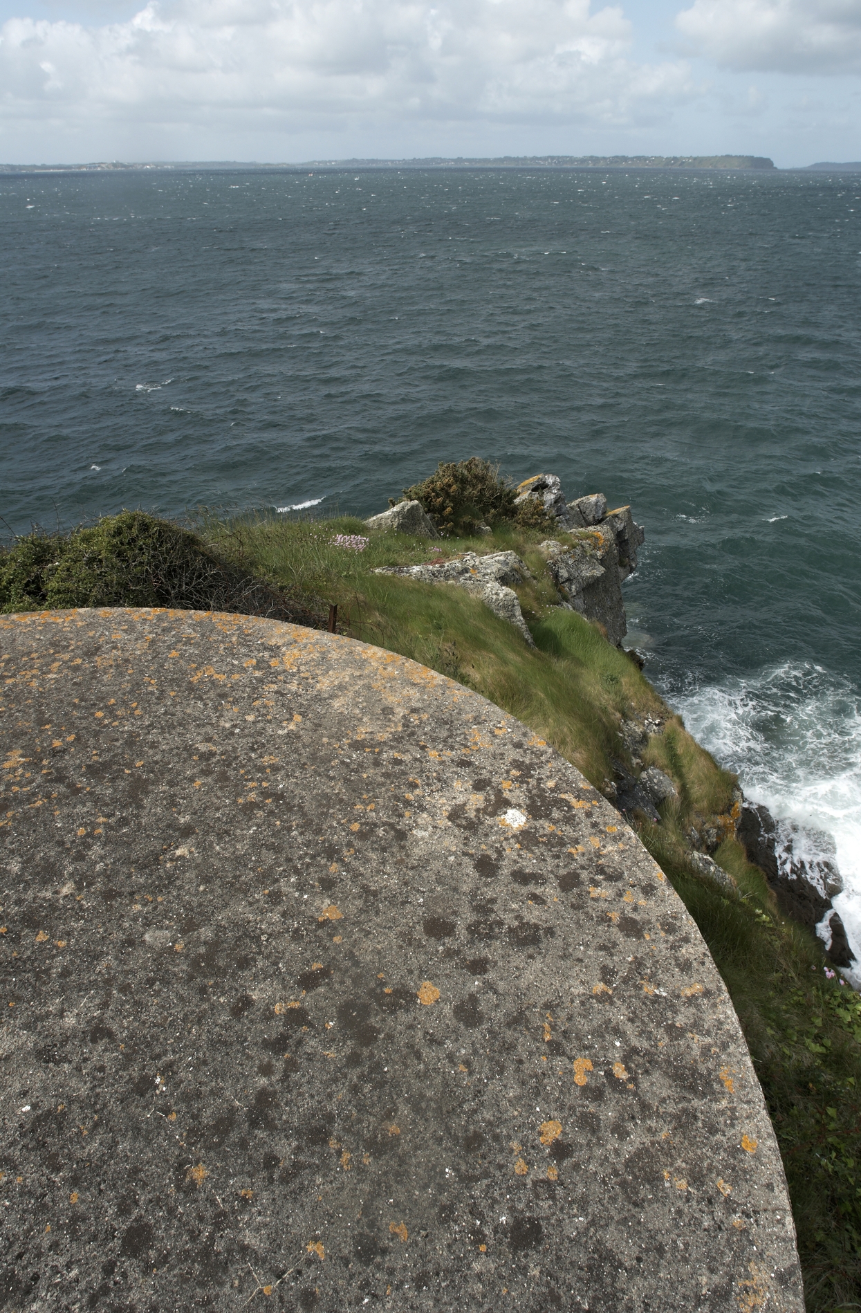 Vue de la dalle de couverture de l'abri de combat du poste photo-électrique sur la batterie basse (état en 2009). En arrière-plan, la rade de Brest, la pointe des Espagnols et le gouletImmatriculation