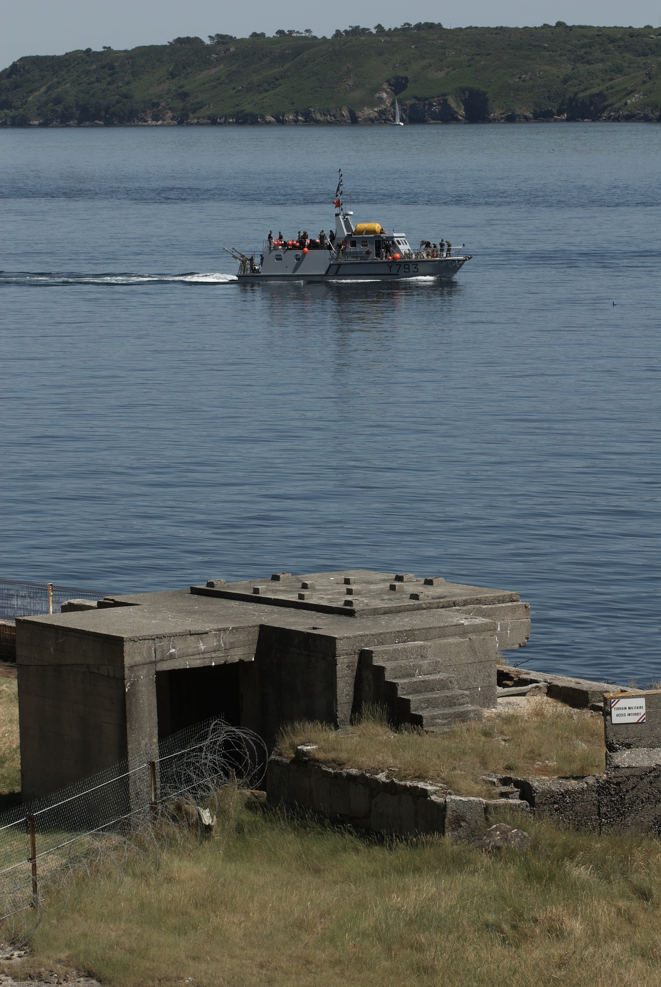 Plouzané : vue du fort du Mengant, détail de la batterie basse, parapet et poste de combat en béton armé (vraisemblablement allemand). En arrière plan : la côte de CornouailleImmatriculation