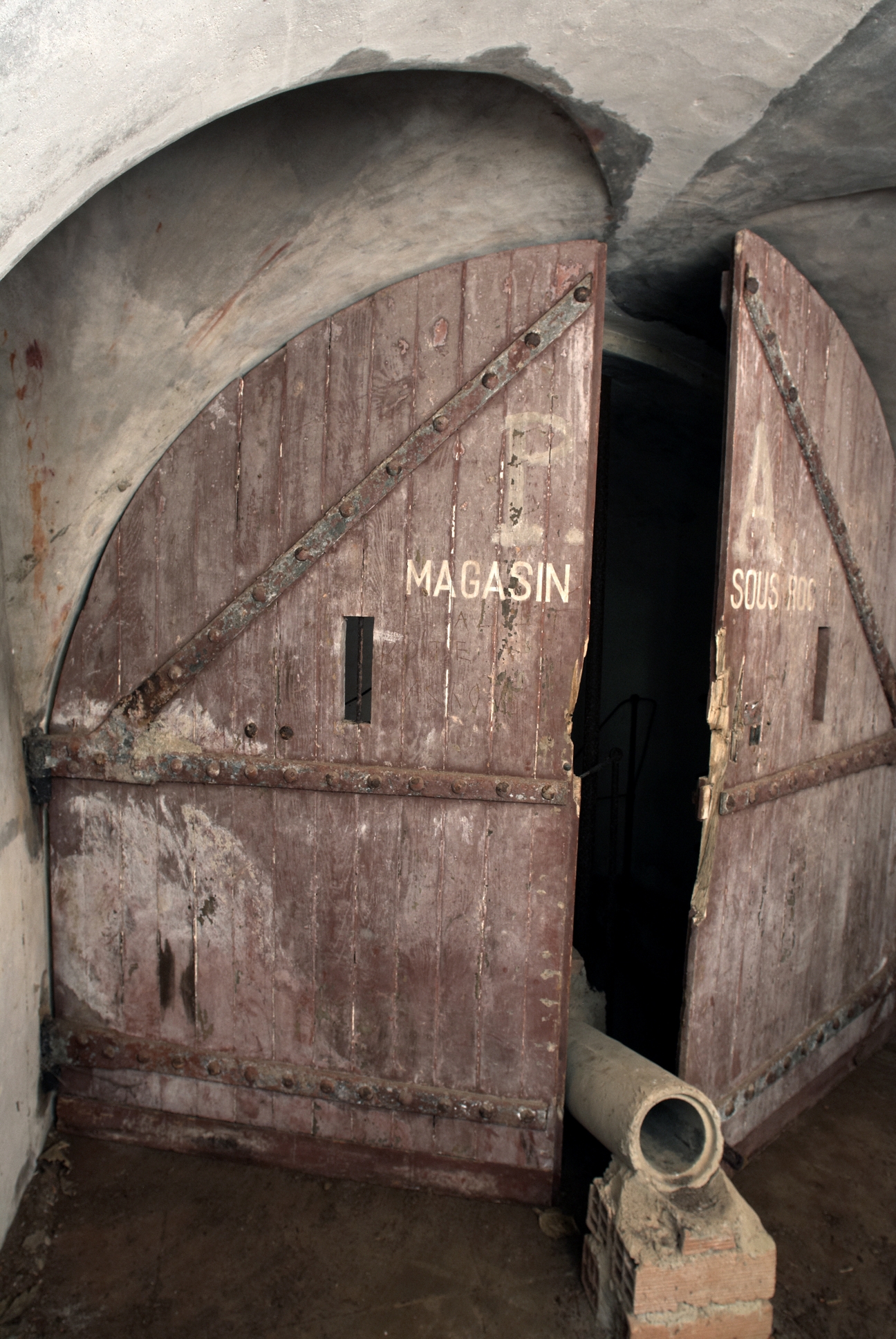 Vue intérieure de la niche de protection du puits du monte-charge du magasin à poudre sous roc : porte à double battants en bois (1890). Les battants conservent leur peinture d'origine et l'inscription MAGASIN SOUS ROCImmatriculation
