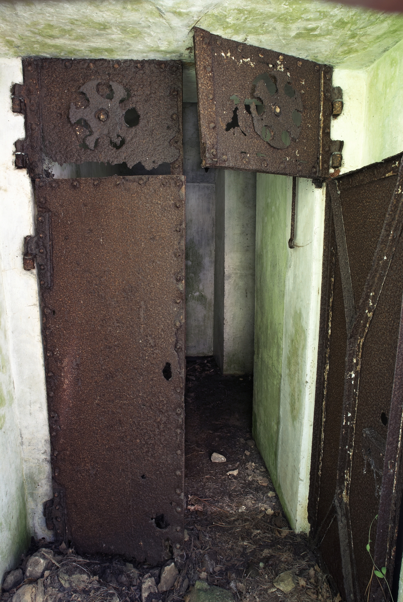 Vue de l'entrée du magasin à munitions. Il conserve du matériel de second œuvre : battants de porte et volets, gonds avec ventilation réglableImmatriculation