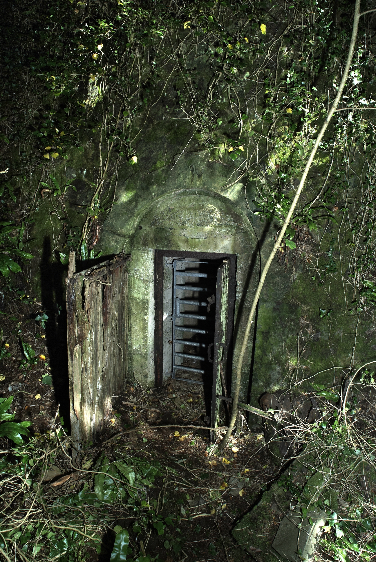 Vue de l'entrée du magasin à poudre sous roc : deux portes sont encore présentes. Une grille de protection a été mise en place pour la protection des chauves-sourisImmatriculation