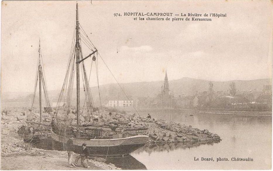 Carte postale. La rivière de l'Hôpital et les chantiers de pierre de kersanton.Immatriculation