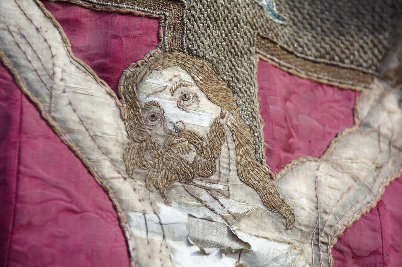 Ensemble de 2 bannières de procession : Christ en croix ; Immaculée Conception ; Sacré Coeur (Rimou),