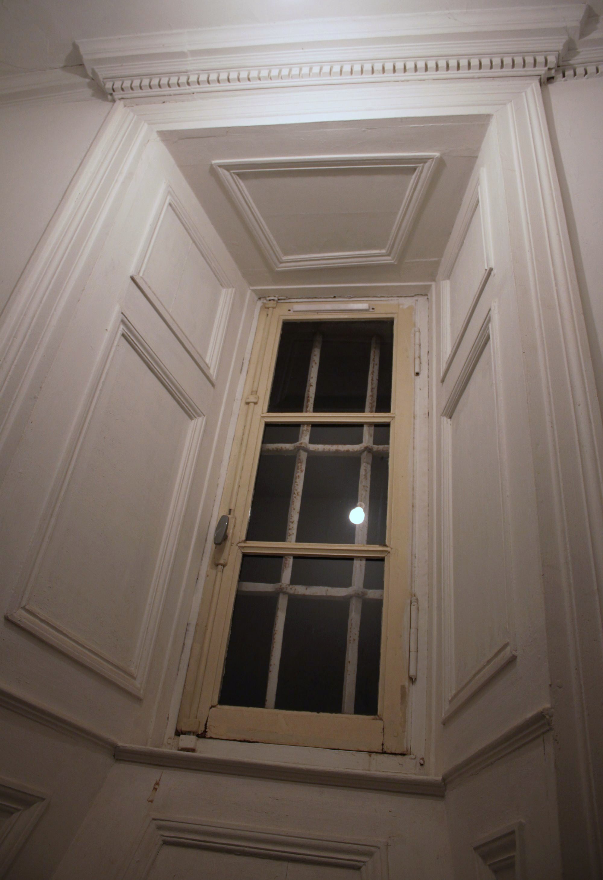 Fenêtre ouest surmontée d'une corniche à denticules, pièce ouest de l'appartement sud du premier étage du corps de logisImmatriculation