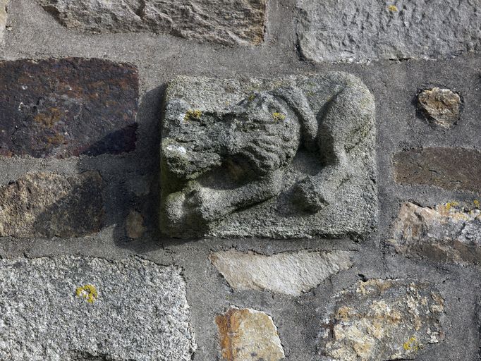 Église, nef, mur sud : pierre ornée d´un lion (état en 2012)Immatriculation