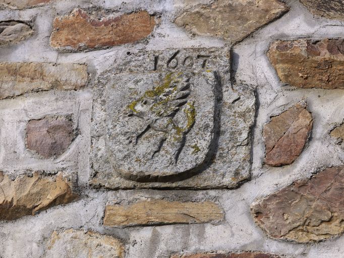 Église, nef, mur sud : écusson portant la date 1697 et des armoiries non identifiées (état en 2012)Immatriculation