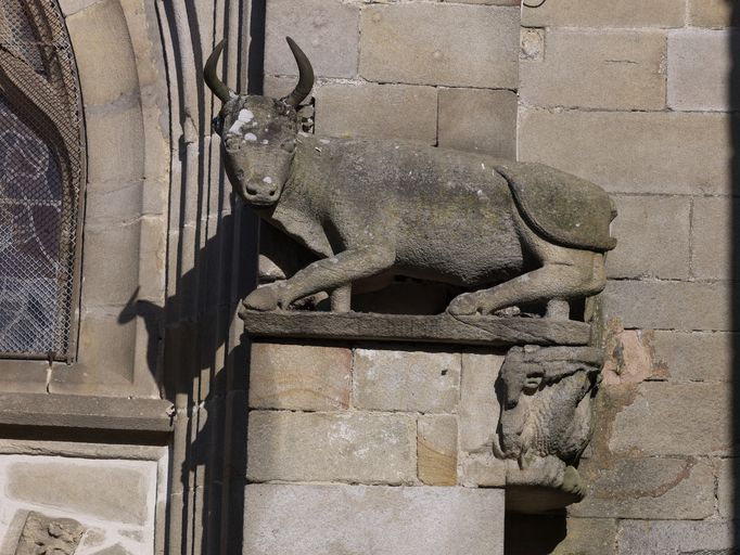 Nef, élévation sud, 4e contrefort à partir de l'ouest, chapiteau (?) : taureau ; en-dessous, modillon : oiseau de proie tenant un agneau dans son bec (état en 2012)Immatriculation