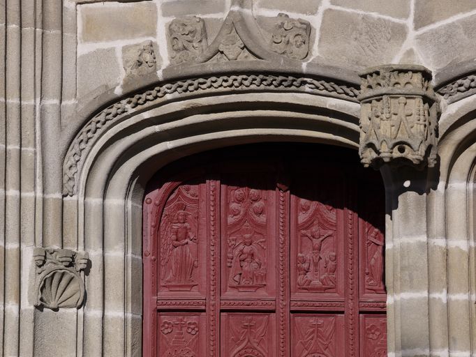Église, élévation sud, porte gauche du portail : décor de la partie supérieure (état en 2012)Immatriculation