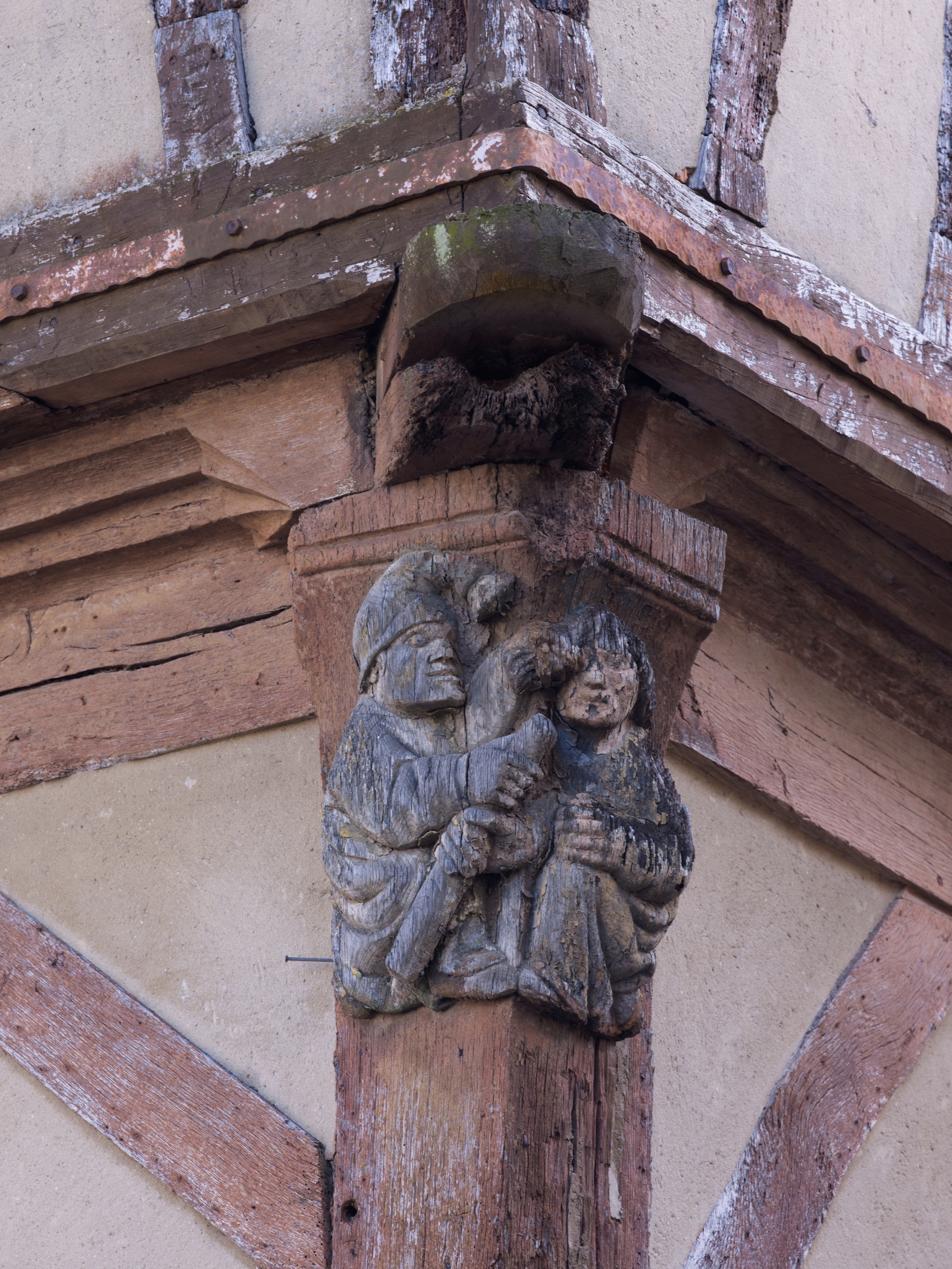 Angle sud-ouest, 1er étage, décor de l'aisselier : homme et femme (état en 2012)Immatriculation