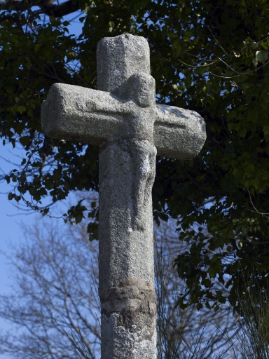 Croix située à l'entrée du village sur l'ancienne RN 165, 15e siècle, remontée vers 1900, détail du croisillonImmatriculation