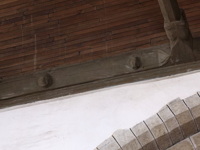 Chœur, mur sud, sablière : une tête de chien ou de cochon et un masque avec capuchon (état en 2011