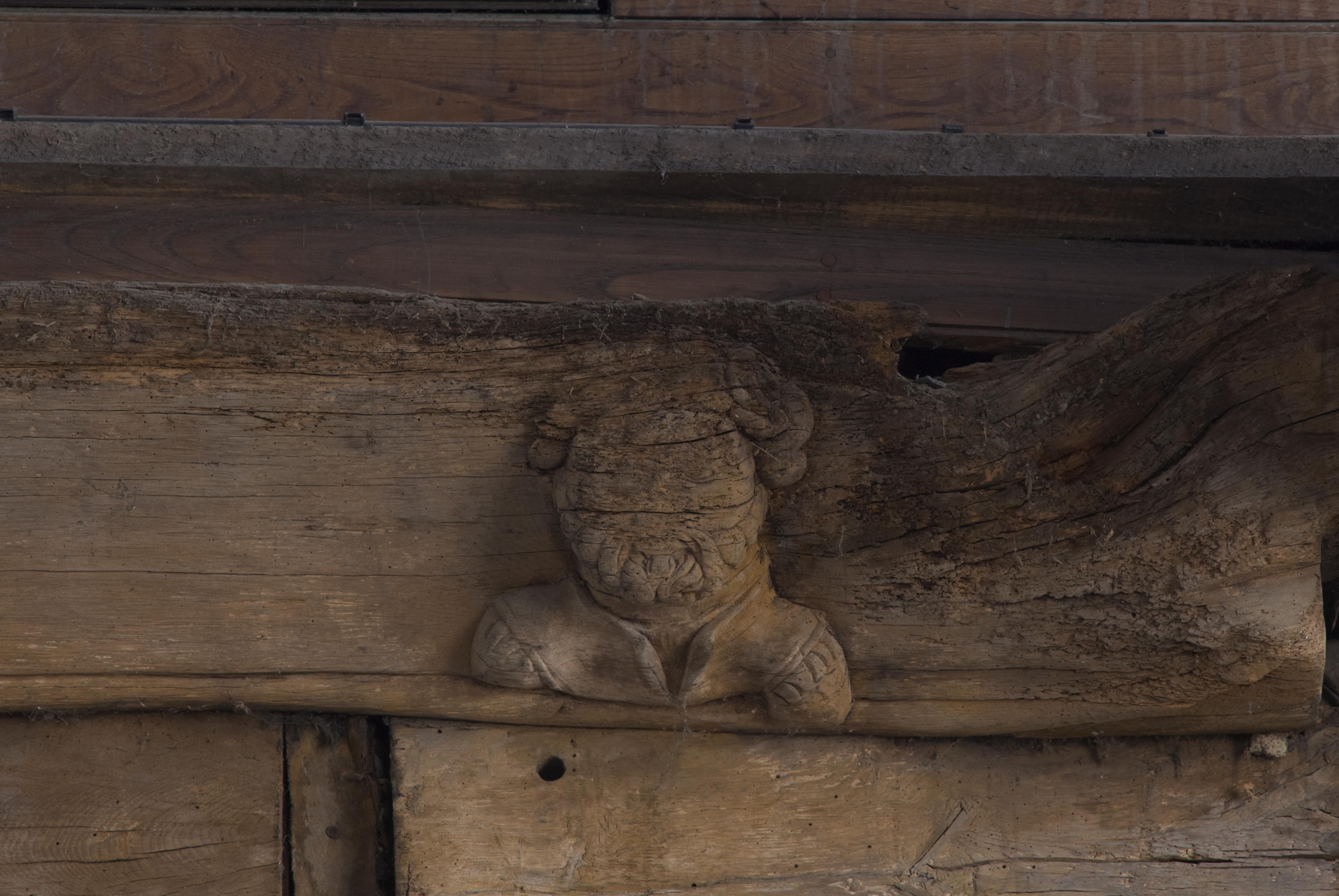 Nef, mur sud, sablière : tête d'homme barbu (état en 2012)Immatriculation