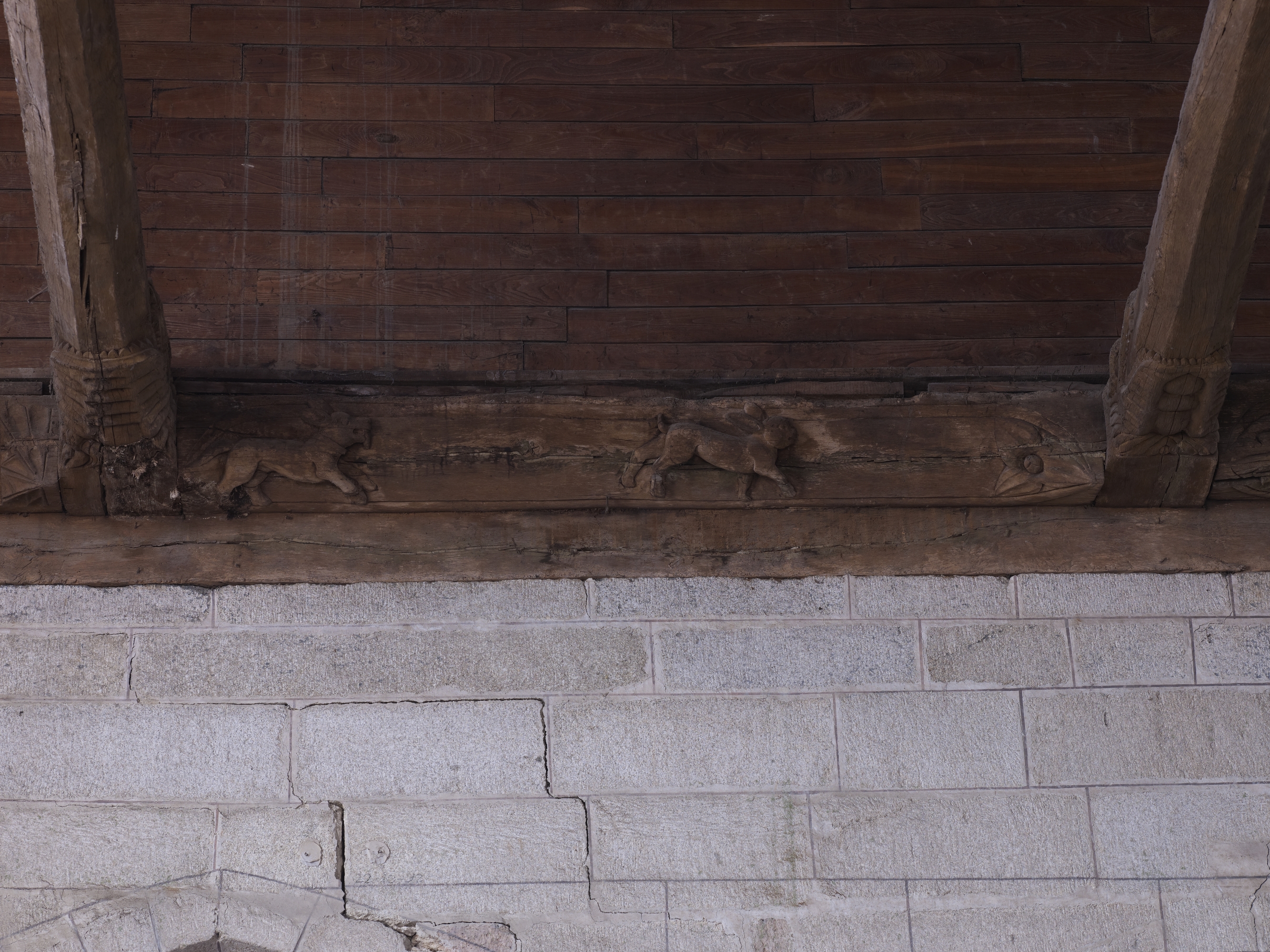 Nef, mur nord, sablière : chien courant après un lièvre (état en 2012)