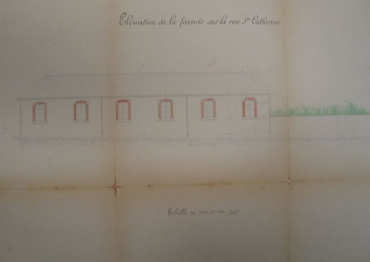 Elévation de la façade sur rue pour l'école Sainte-Catherine par E. de Lamarzelle, 1879. AM Vannes 4 M 203.Immatriculation