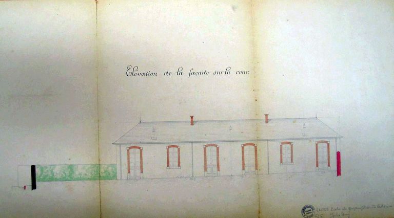 Elévation de la façade sur cour pour l'école Sainte-Catherine par E. de Lamarzelle, 1879. AM Vannes 4 M 203.Immatriculation