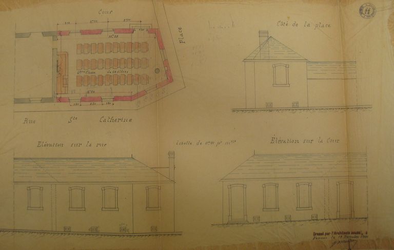 Plan et élévations d'une quatrième classe par G. Muiron, 13 décembre 1901. AM Vannes 4M203.Immatriculation