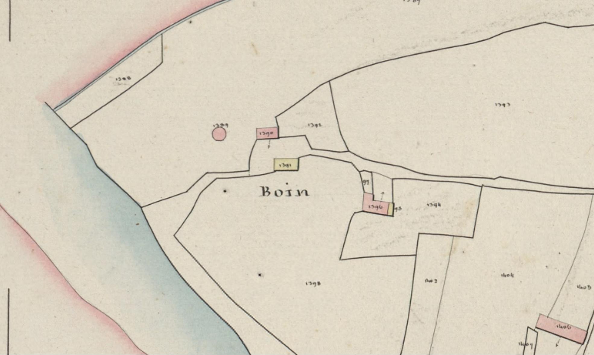 Les Fougerêts. Cadastre napoléonien, section E2 du bourg. Levée par M. Thébaut, géomètre, 1824, échelle 1:2500.