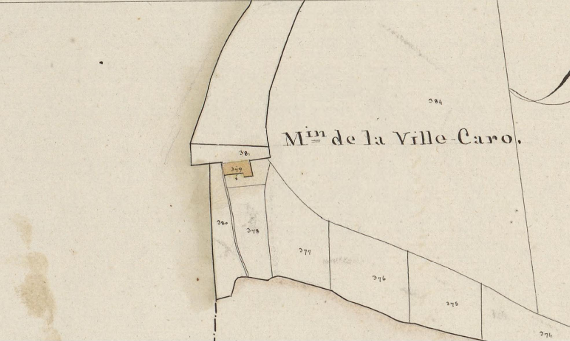 Le moulin à eau de la Ville Caro sur le cadastre de 1824 (A. D. du Morbihan, 3 P 157/7)Immatriculation