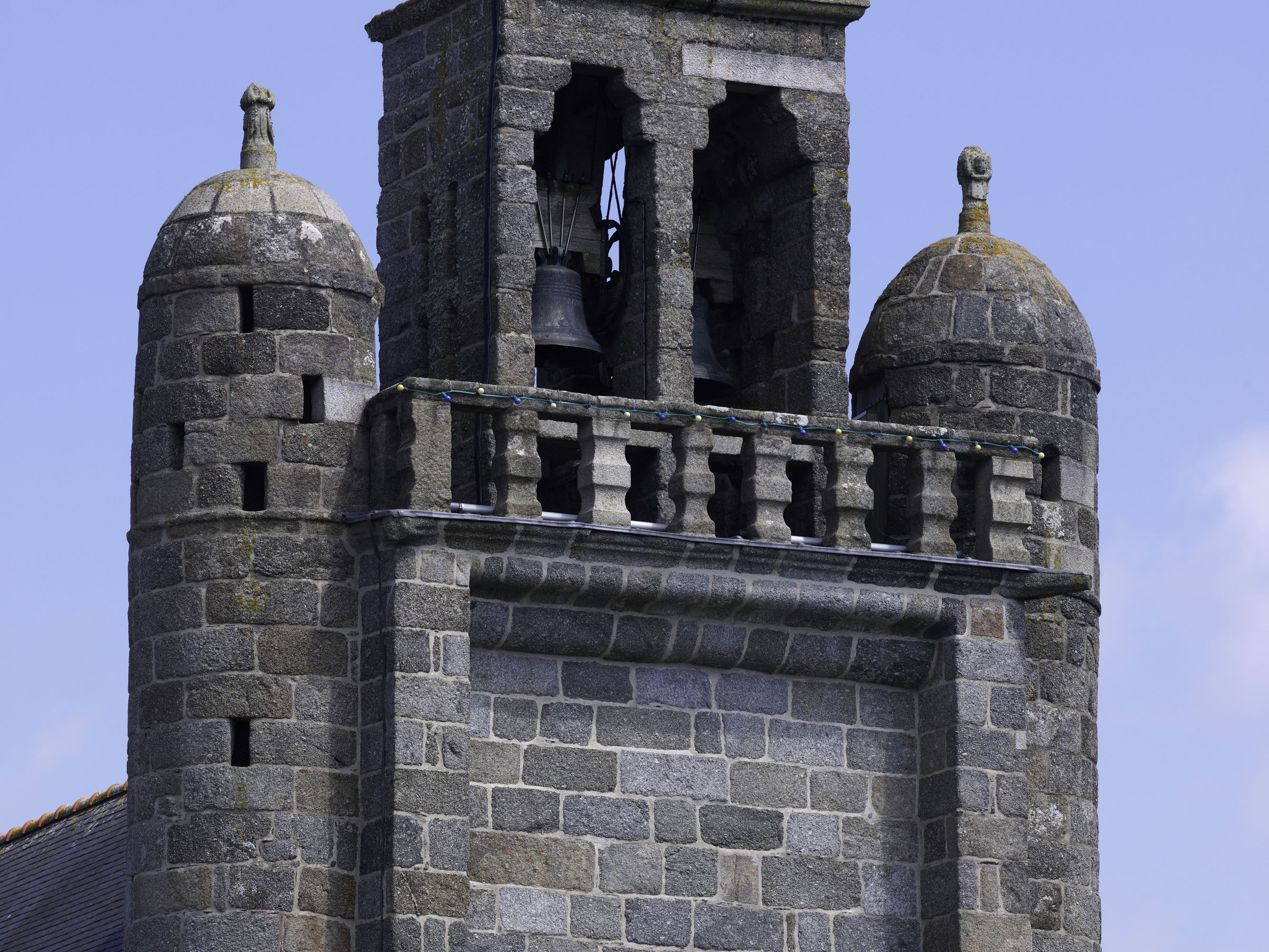 Caouënnec-Lanvézéac, bourg de Caouënnec : église paroissiale de Notre-Dame, vue de détail des tours d'escalier du clocherImmatriculation