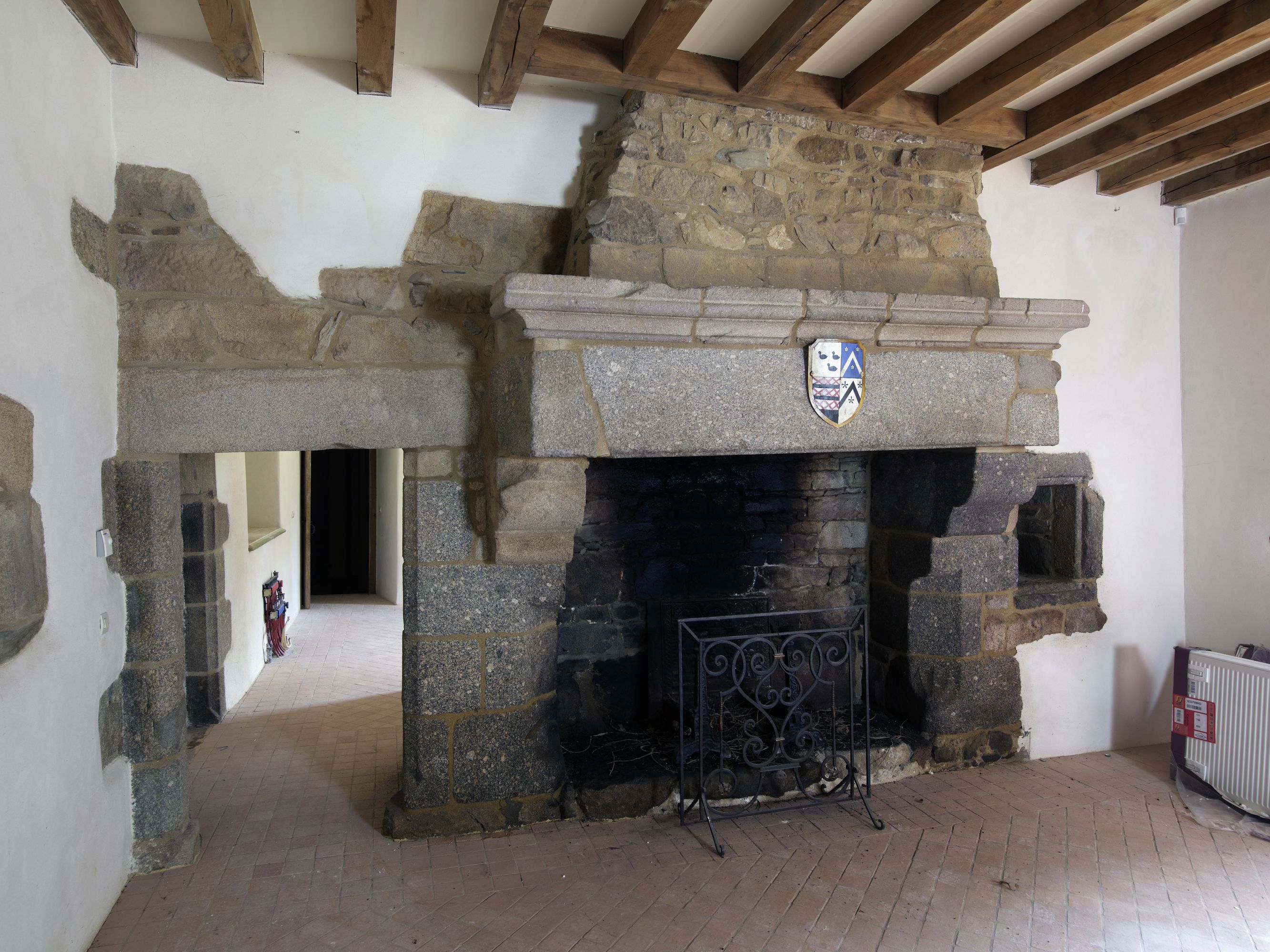 Caouënnec-Lanvézéac, Runoden : manoir, vue intérieure, partie est, rez-de-chaussée, cheminée et porte percée dans le mur de refendImmatriculation