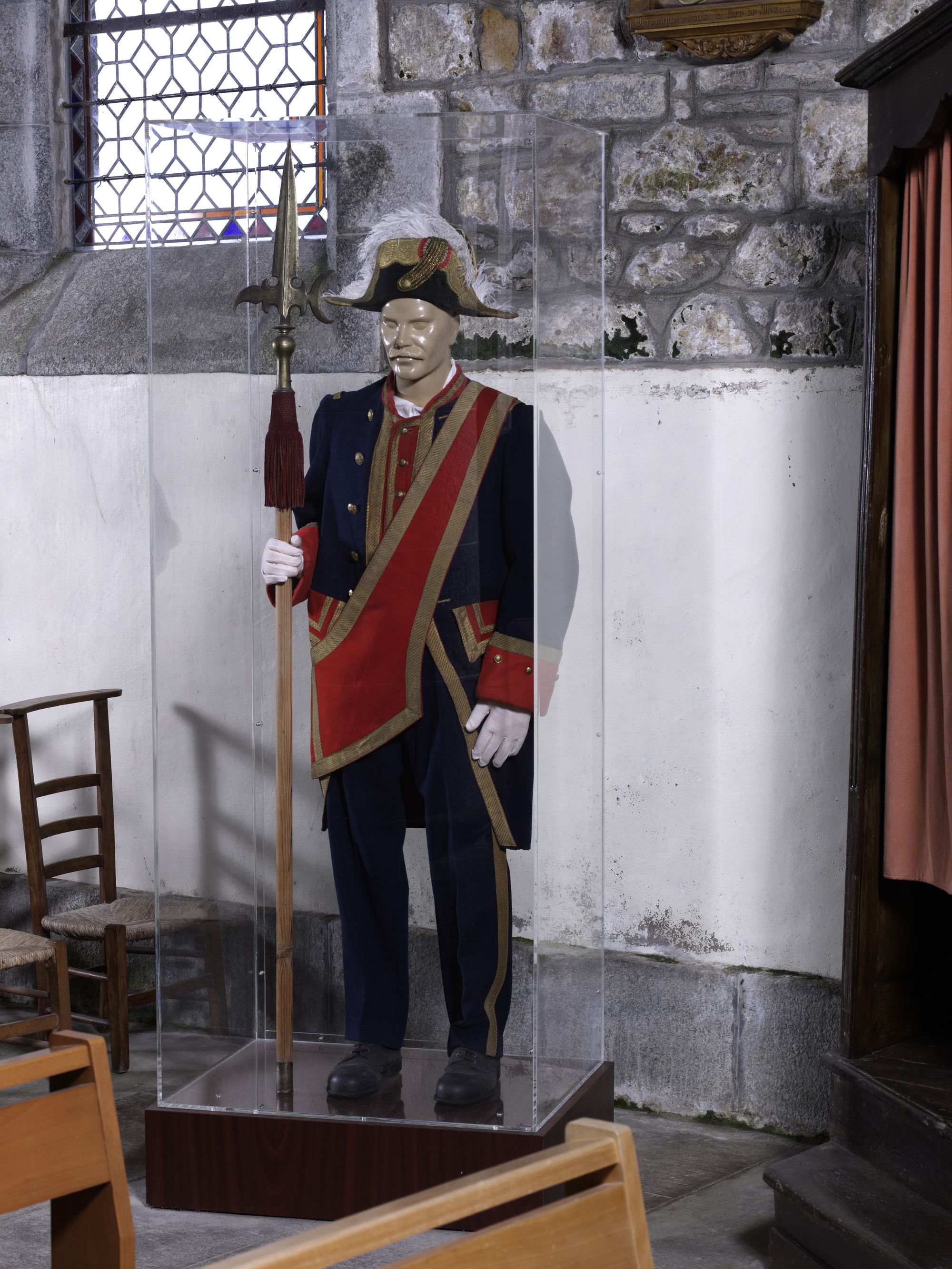 Caouënnec-Lanvézéac, bourg de Caouënnec : église paroissiale de Notre-Dame, uniforme de Suisse d'église ou bedeau, présenté sur mannequin dans une vitrine.Immatriculation