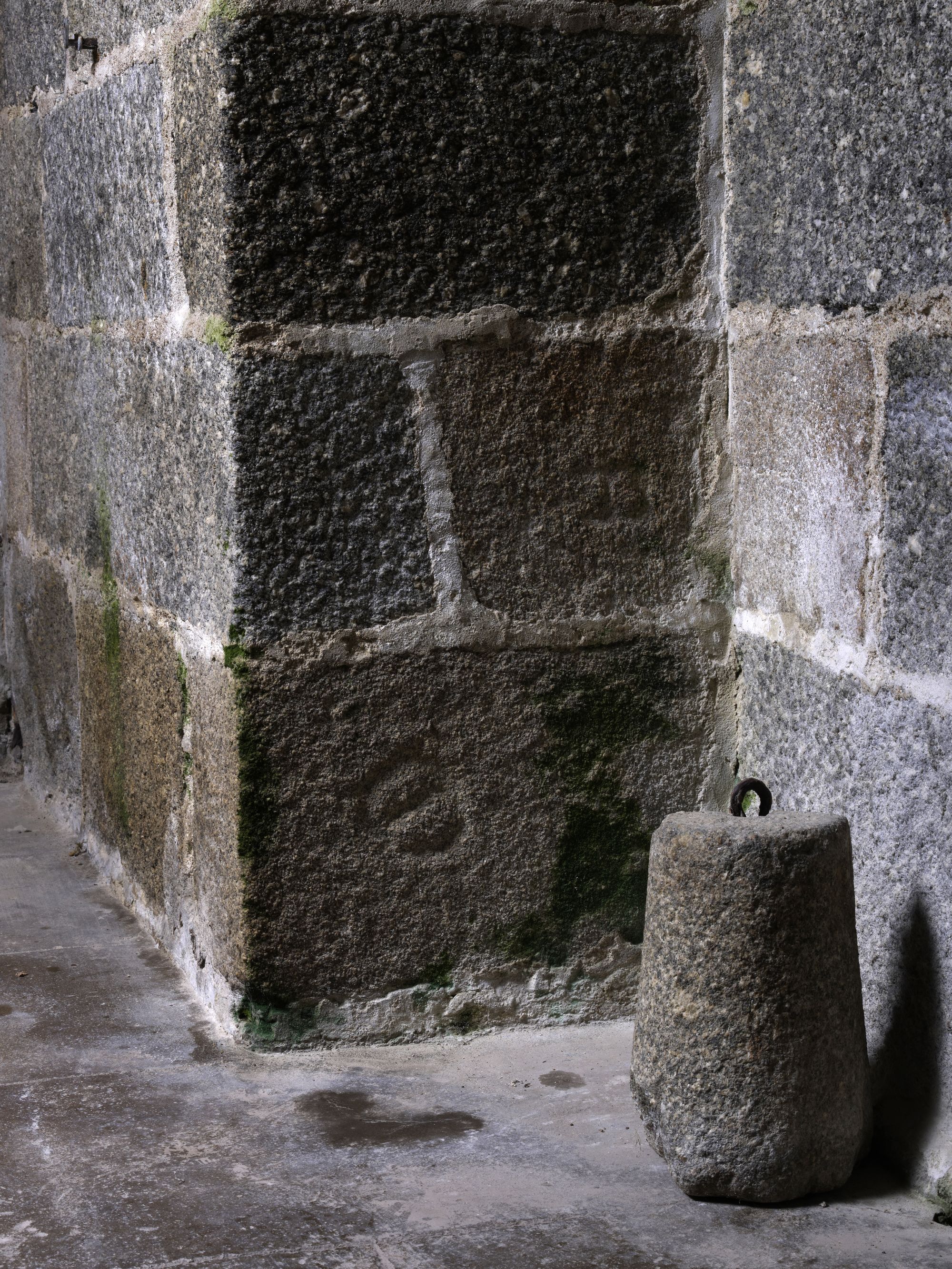 Caouënnec-Lanvézéac, bourg de Caouënnec : église paroissiale de Notre-Dame, marque de tâcherons sur la base du mur clocherImmatriculation