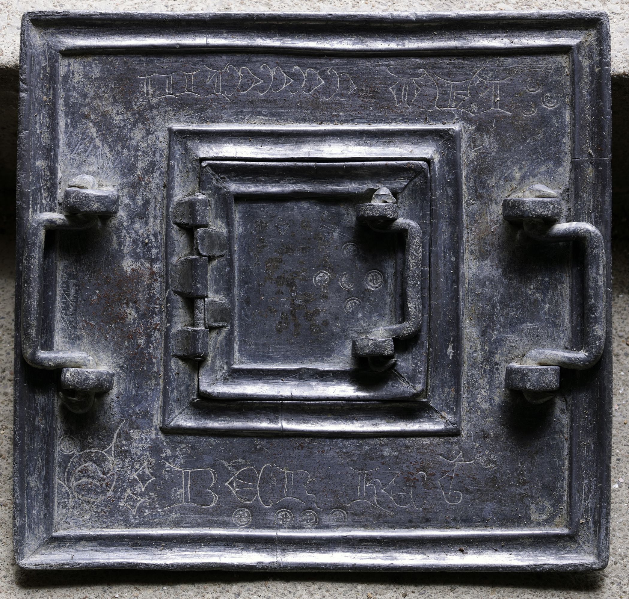 Berhet, le bourg : église paroissiale de Sainte-Brigitte, couvercle en plomb des fonts baptismauxImmatriculation