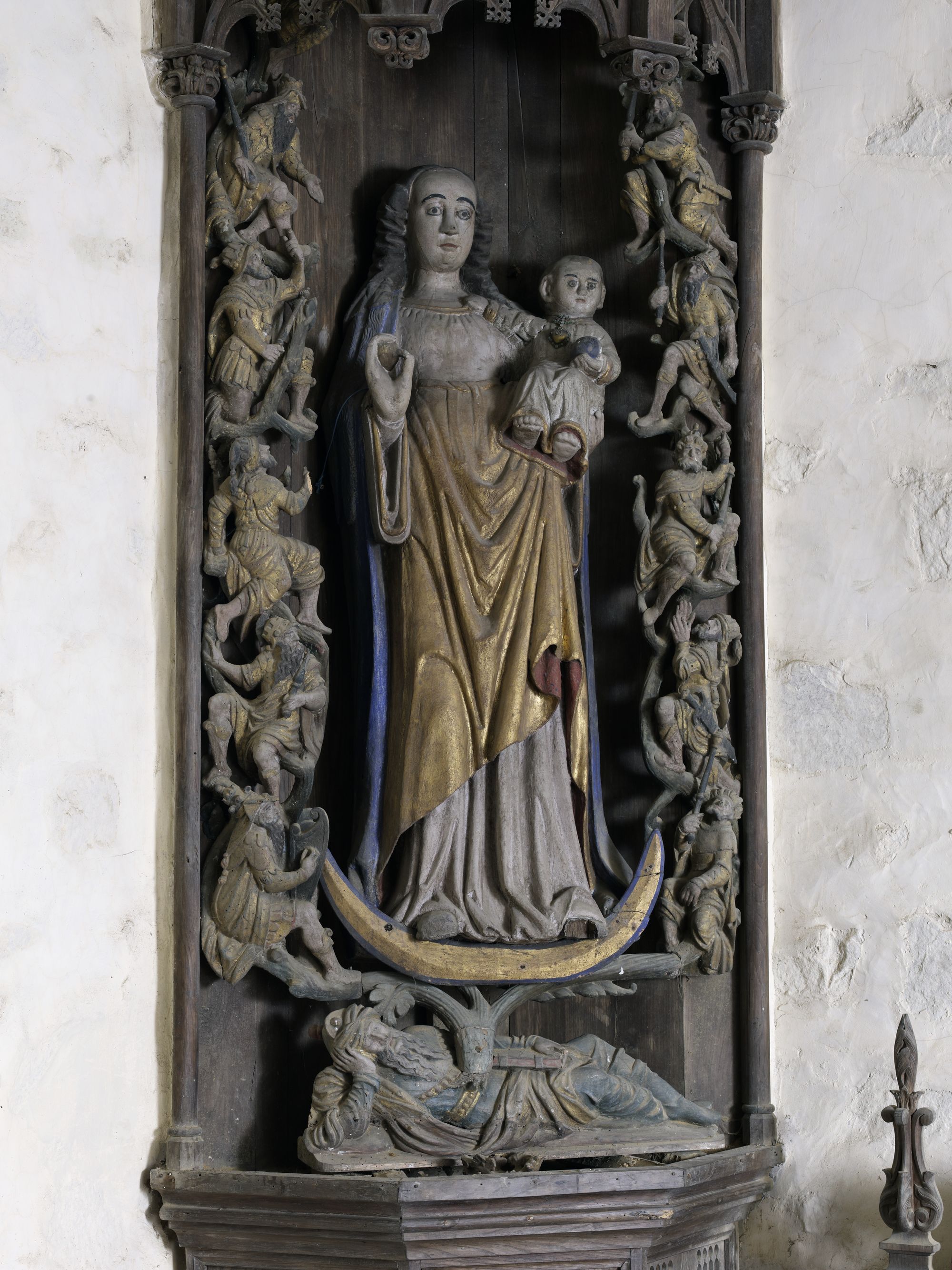 Berhet, Confort : chapelle Notre-Dame de Confort, angle nord-est, détail de la statue de la Vierge à l'enfantImmatriculation