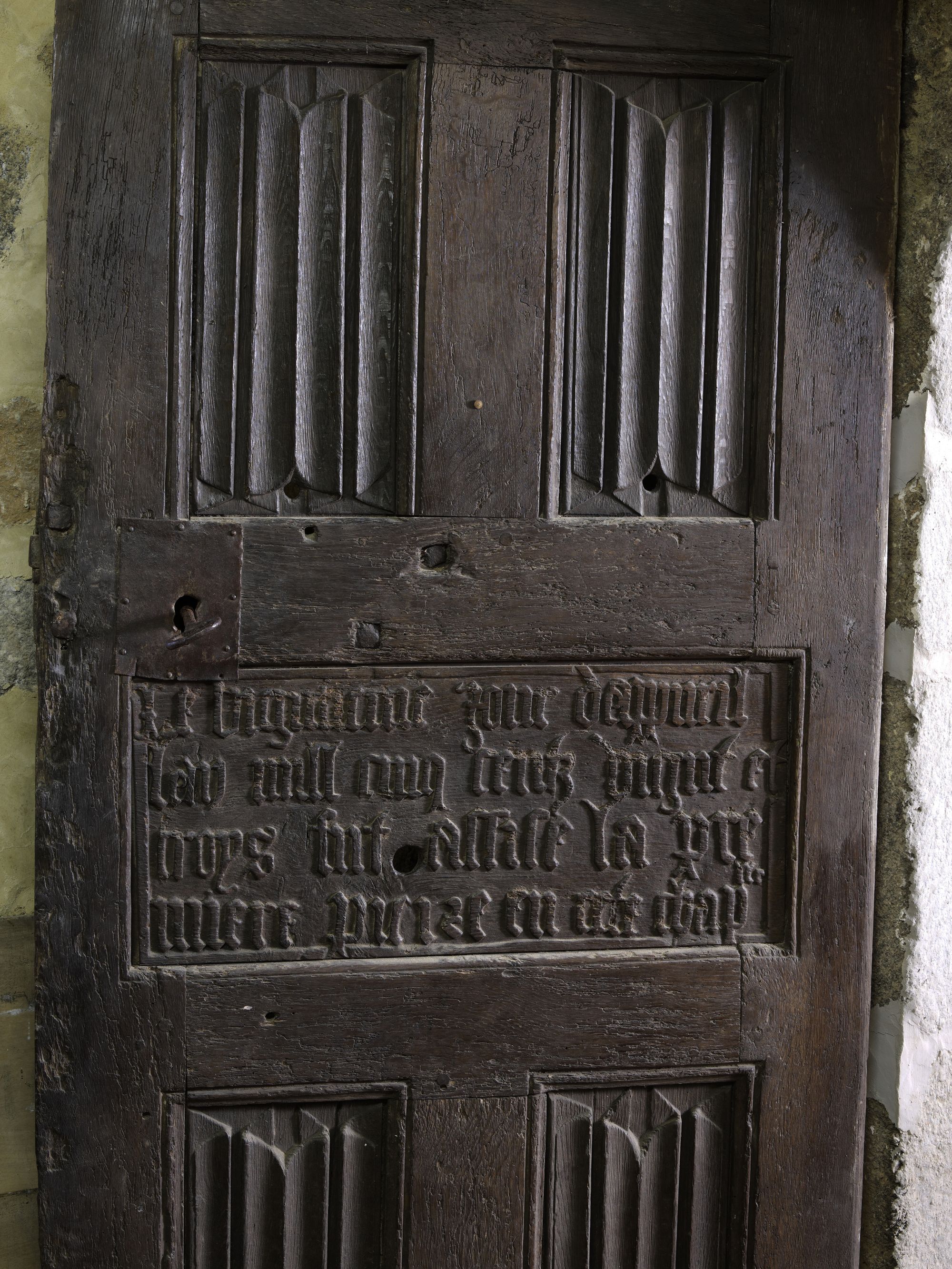 Berhet, Confort : chapelle Notre-Dame de Confort, vue de la porte de la sacristie, détail des inscriptionsImmatriculation