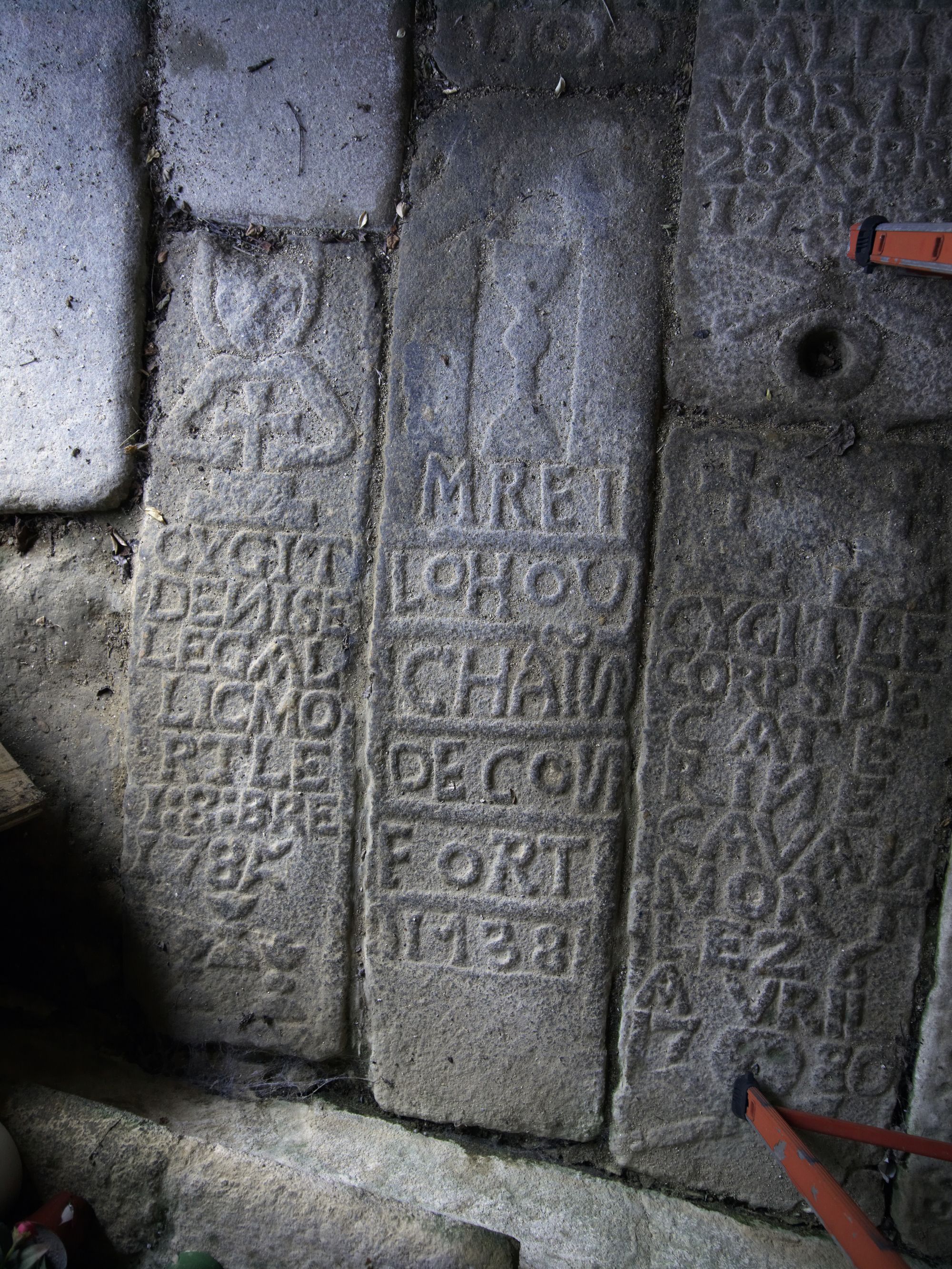 Berhet, Confort : chapelle Notre-Dame de Confort, porche sud, pierres tombales de 1738 et 1785. Elles ont été remployées comme pavement de porcheImmatriculation