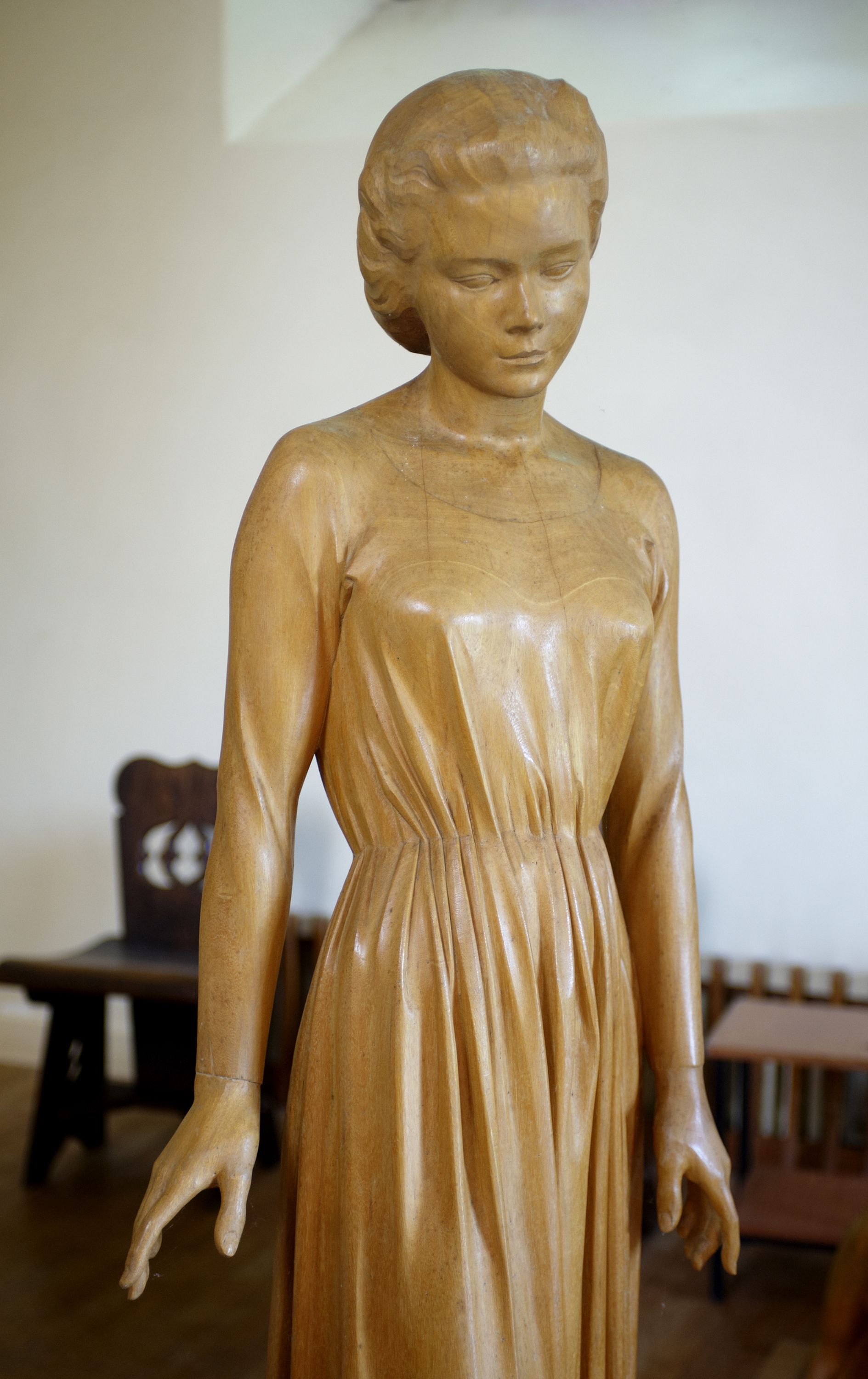 Intérieur de la chapelle des Bas Foins, sculpture de l'Annonciation (1968), de Jean Fréour, vue rapprochéeImmatriculation