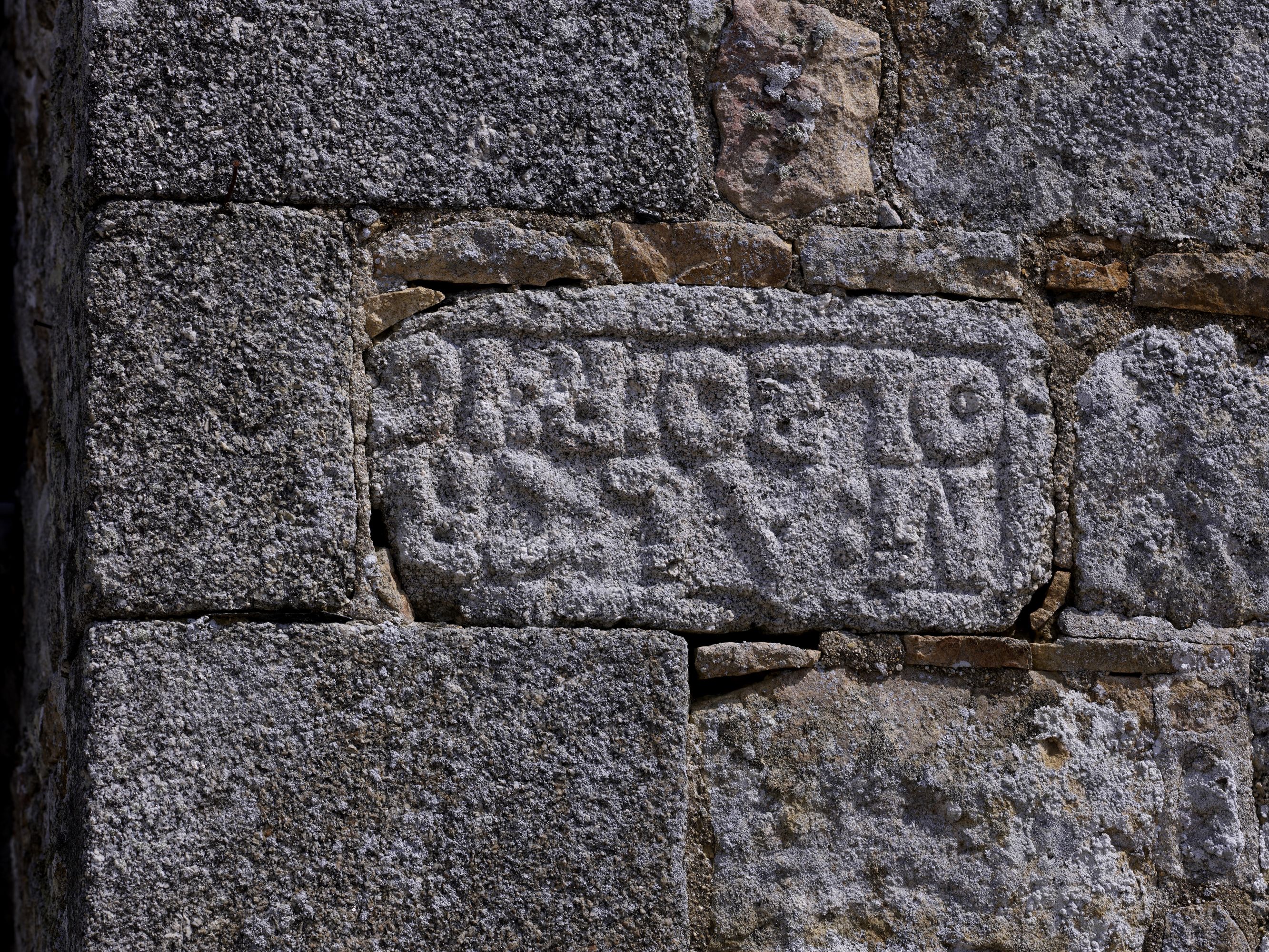 Berhet, le bourg : église paroissiale de Sainte-Brigitte, transept sud, vue de détail d'une pierre, inscriptionImmatriculation