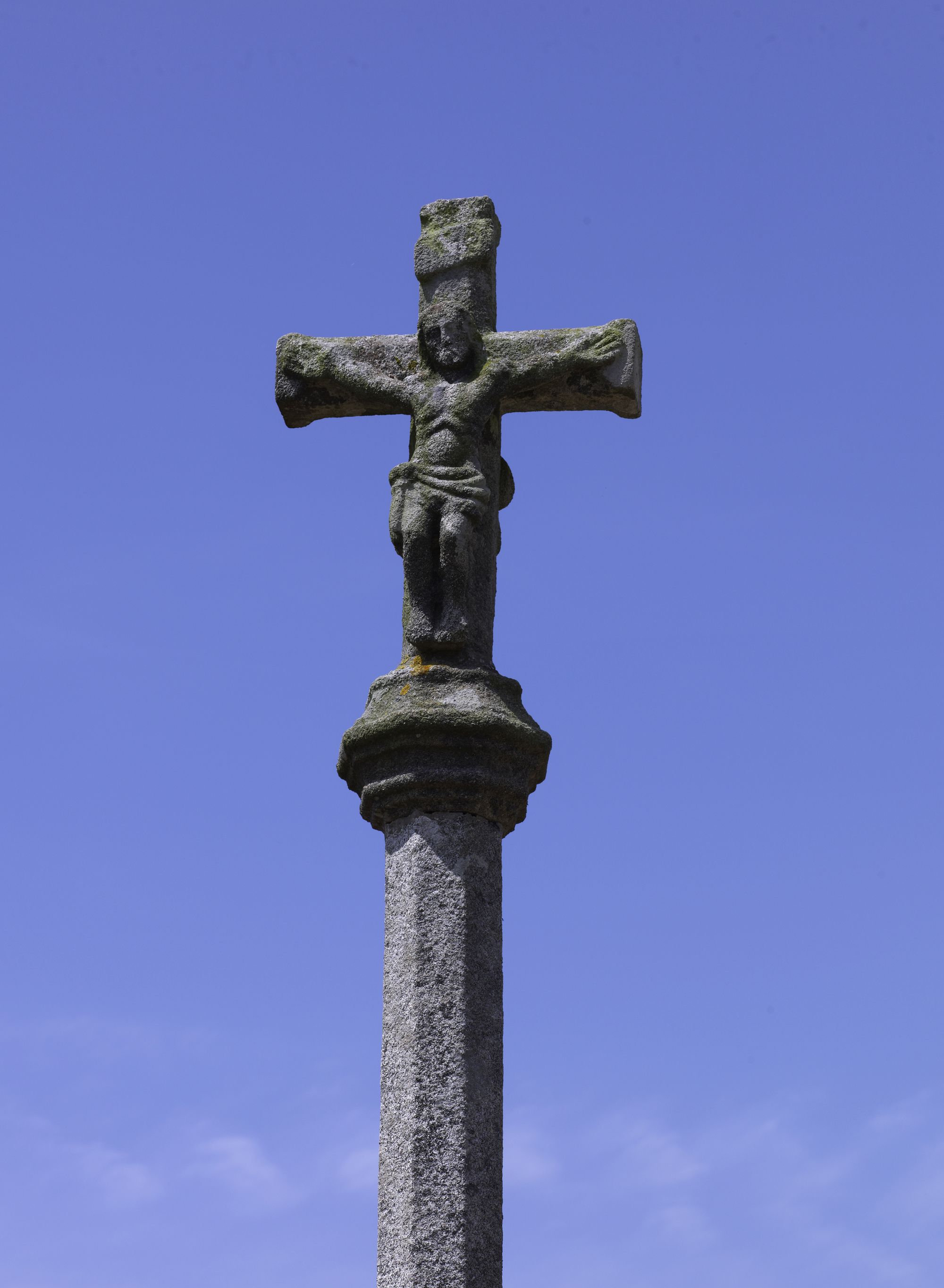 Tonquédec, le bourg, place de l'église : croix monumentale, Christ en croix, vue de détailImmatriculation