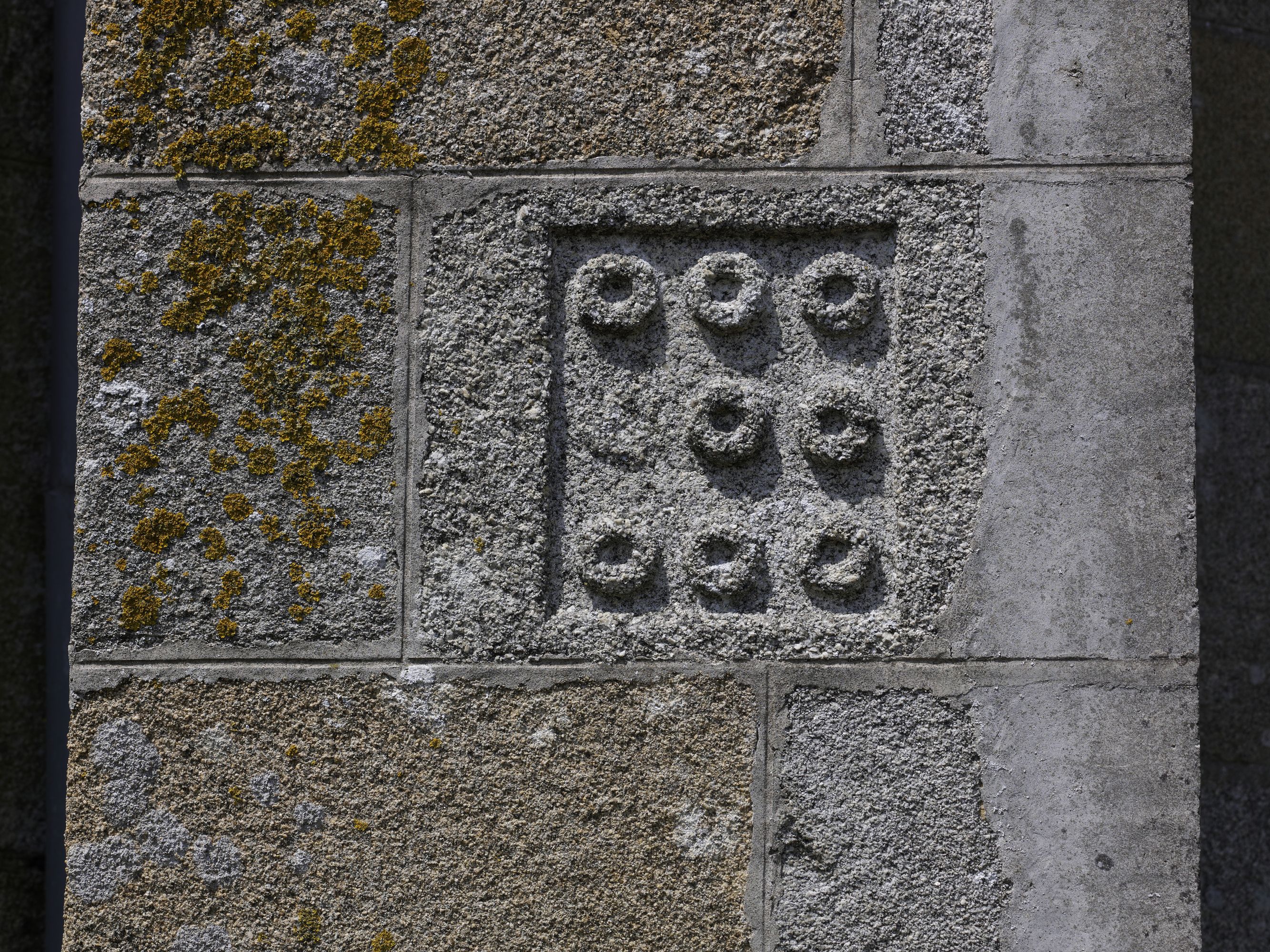 Tonquédec, le bourg : église paroissiale Saint-Pierre, contrefort du chevet est, armoiries. Il s'agit des armoiries de la famille de CoëtmenImmatriculation