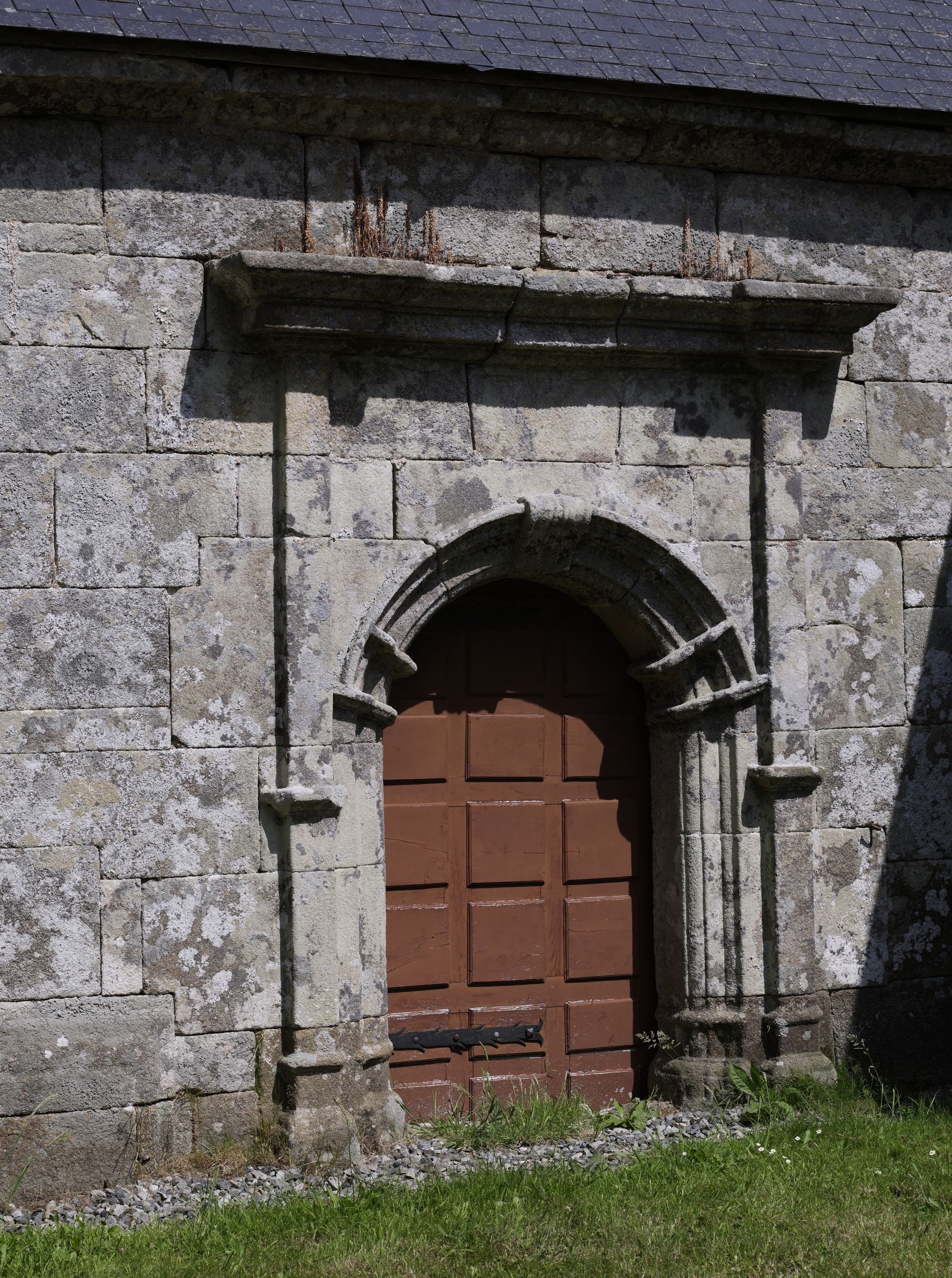 Tonquédec, Saint-Gildas : chapelle, transept nord, porte ouest de style Renaissance, vue de détail de l'ornementationImmatriculation