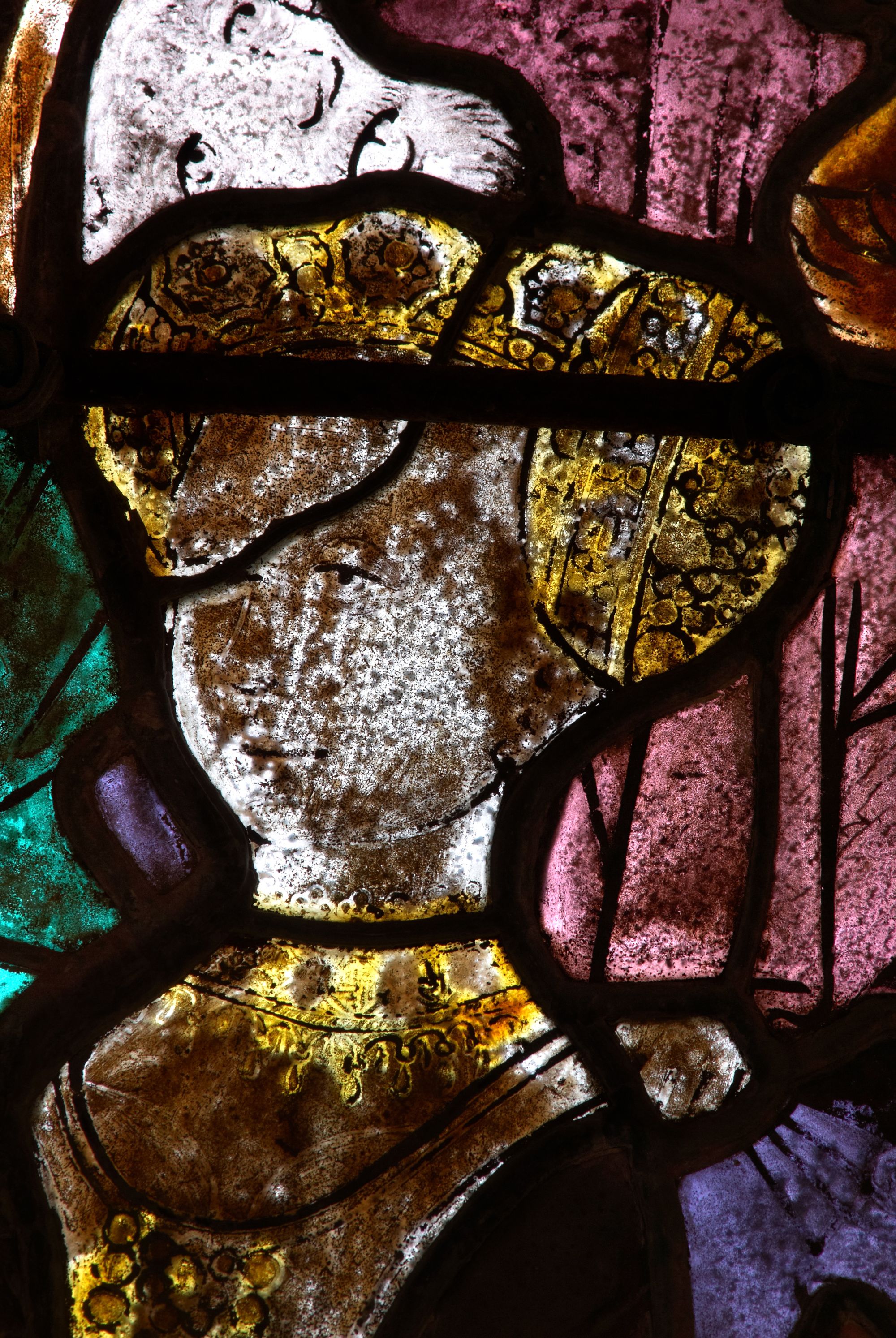 Tonquédec, le bourg : église paroissiale Saint-Pierre, vue intérieure, détail des vitrauxImmatriculation