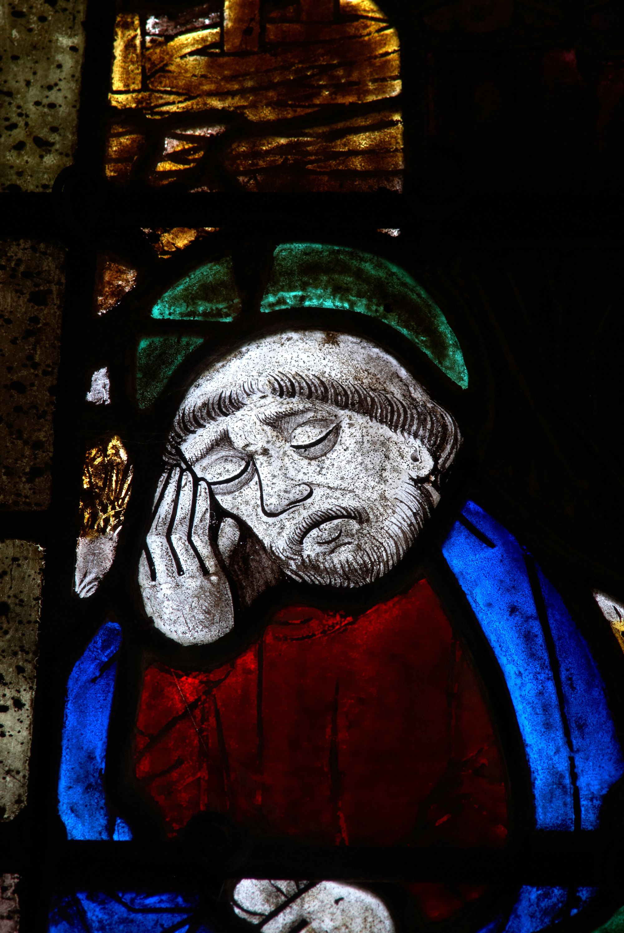 Tonquédec, le bourg : église paroissiale Saint-Pierre, vue intérieure, détail des vitrauxImmatriculation