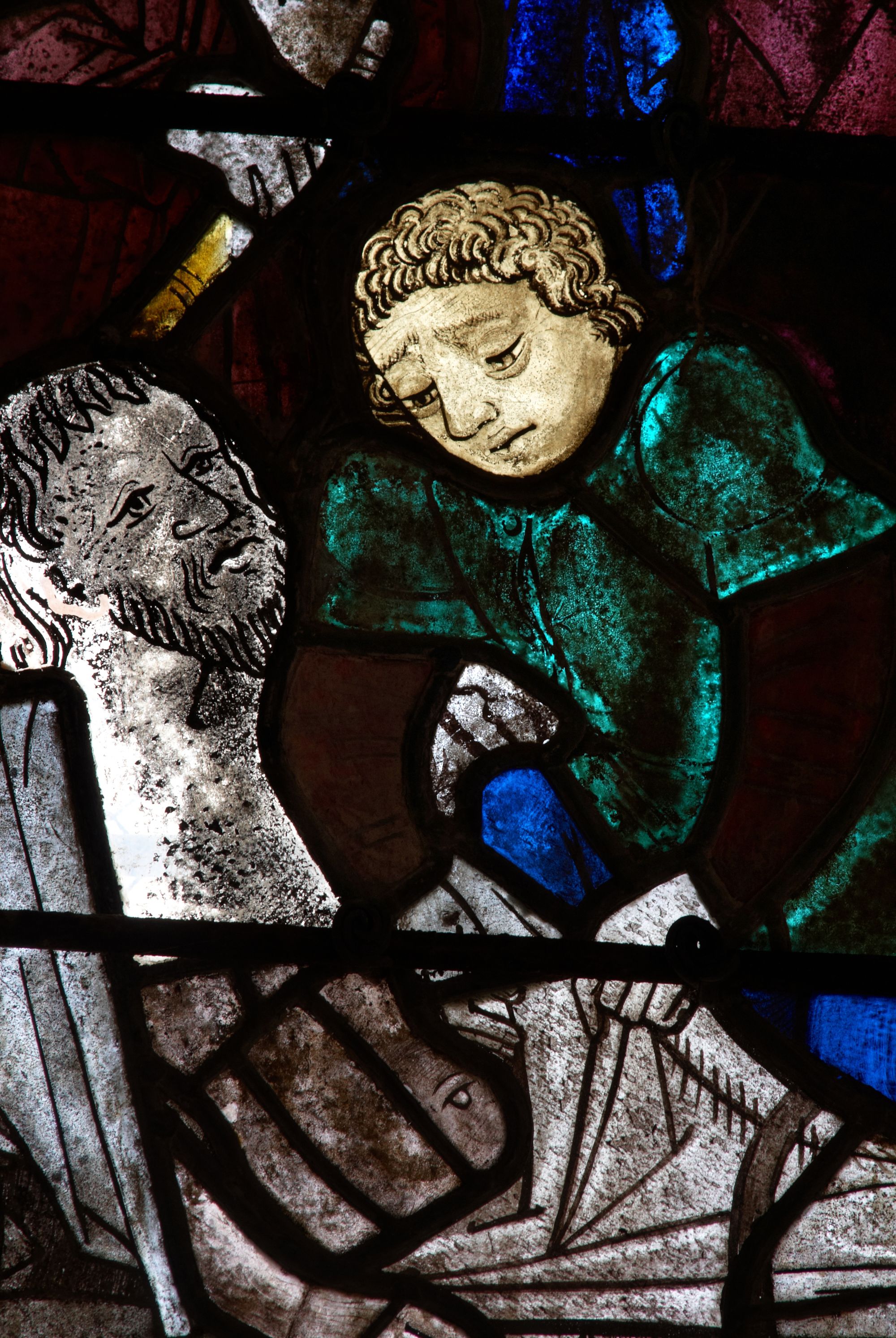 Tonquédec, le bourg : église paroissiale Saint-Pierre, vue intérieure, détail des vitrauxImmatriculation