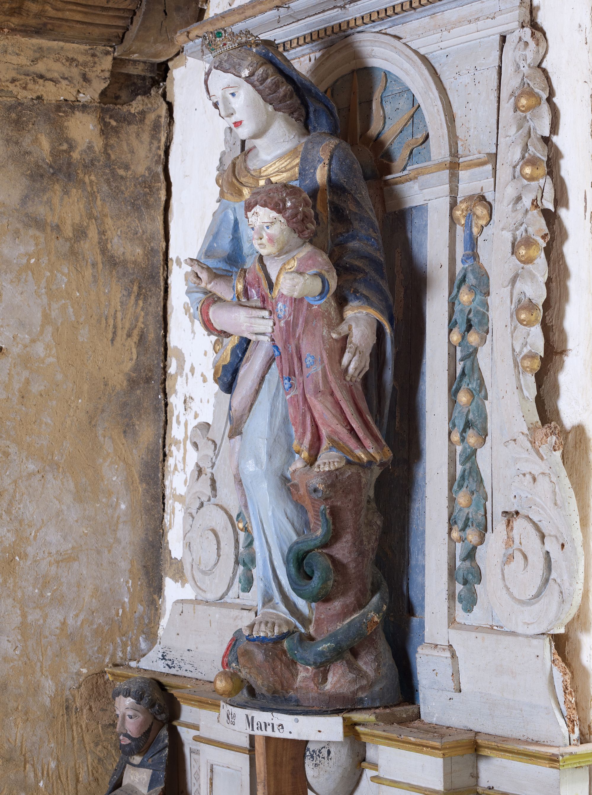 Tonquédec, Kerrivoalan : chapelle Notre-Dame, vue intérieure, maitre-autel, statue de Sainte Marie, Vierge à l'enfantImmatriculation