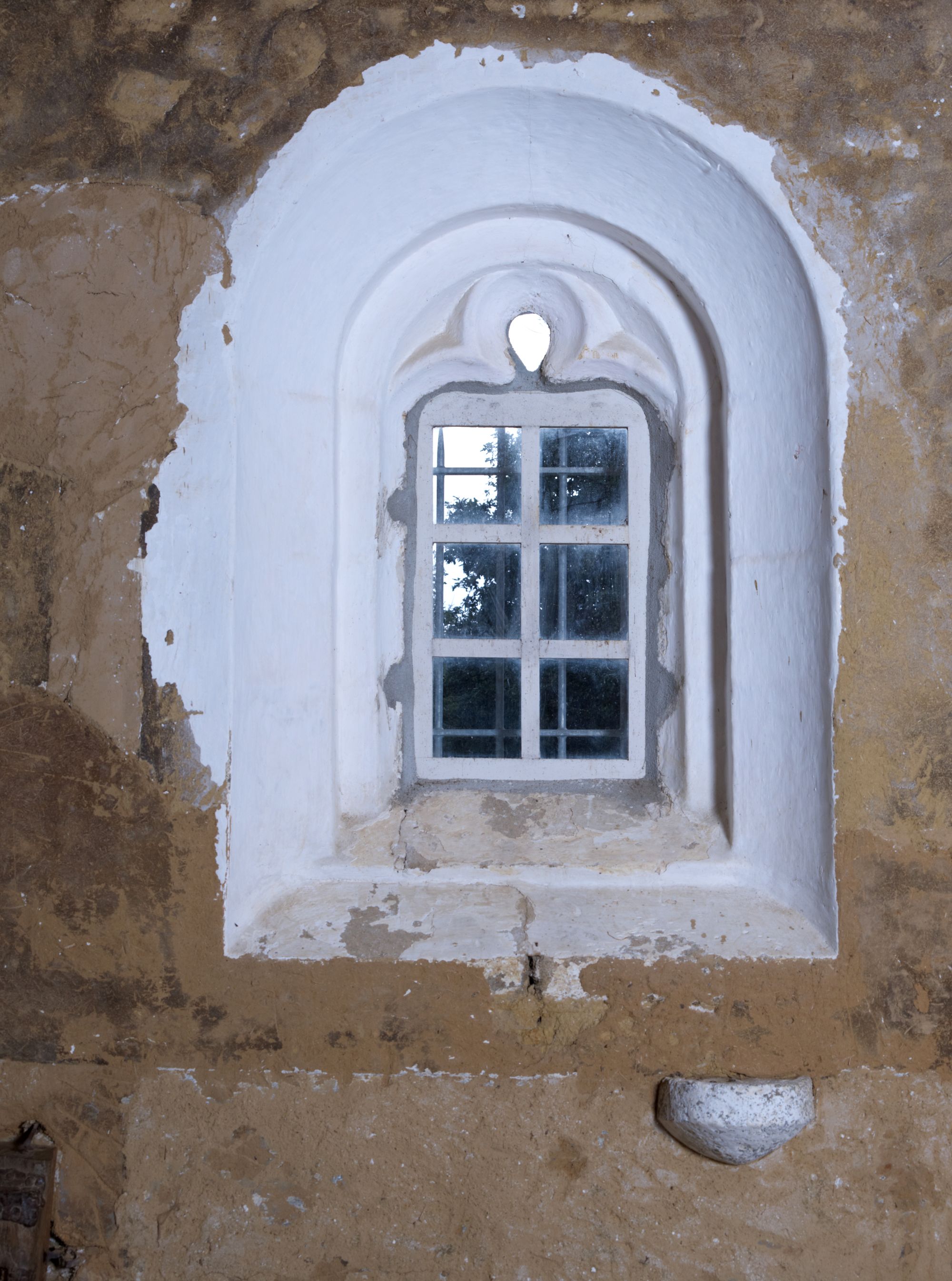 Tonquédec, Kerrivoalan : chapelle Notre-Dame, vue intérieure, mur sud, petite fenêtre à remplages et bénitierImmatriculation
