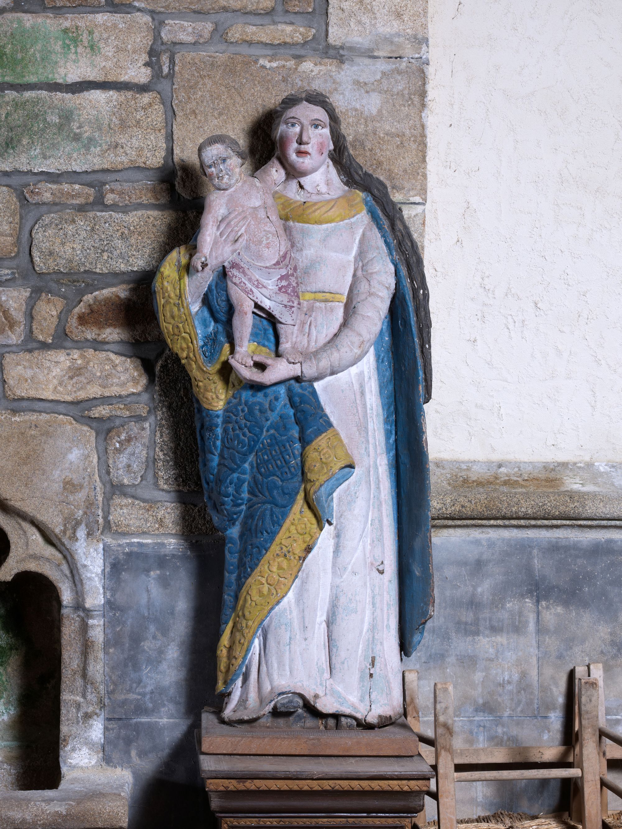 Tonquédec, le bourg : église paroissiale Saint-Pierre, vue intérieure, statue de la Vierge à l'enfantImmatriculation
