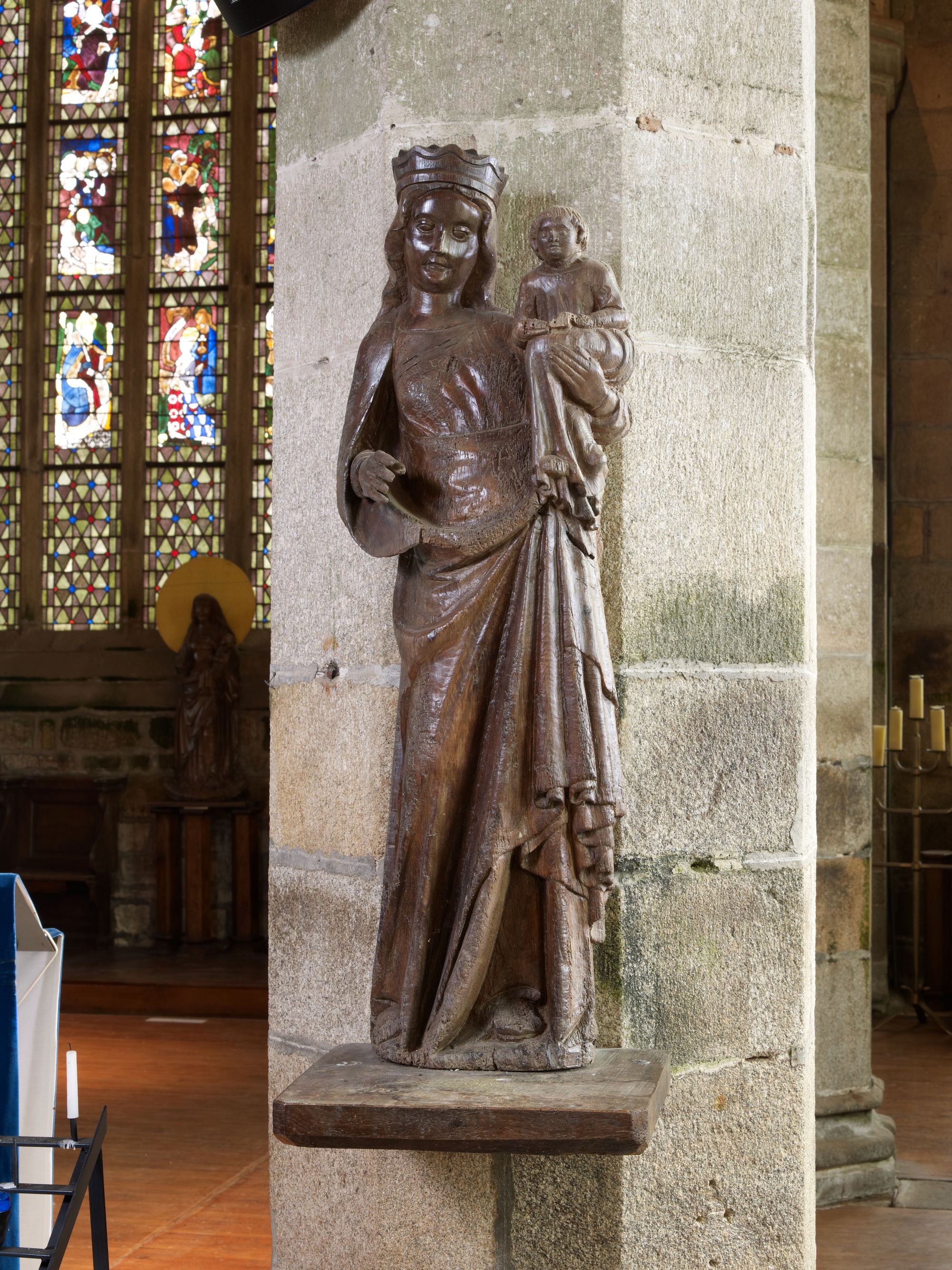 Tonquédec, le bourg : église paroissiale Saint-Pierre, vue intérieure, statue de Vierge à l'enfantImmatriculation
