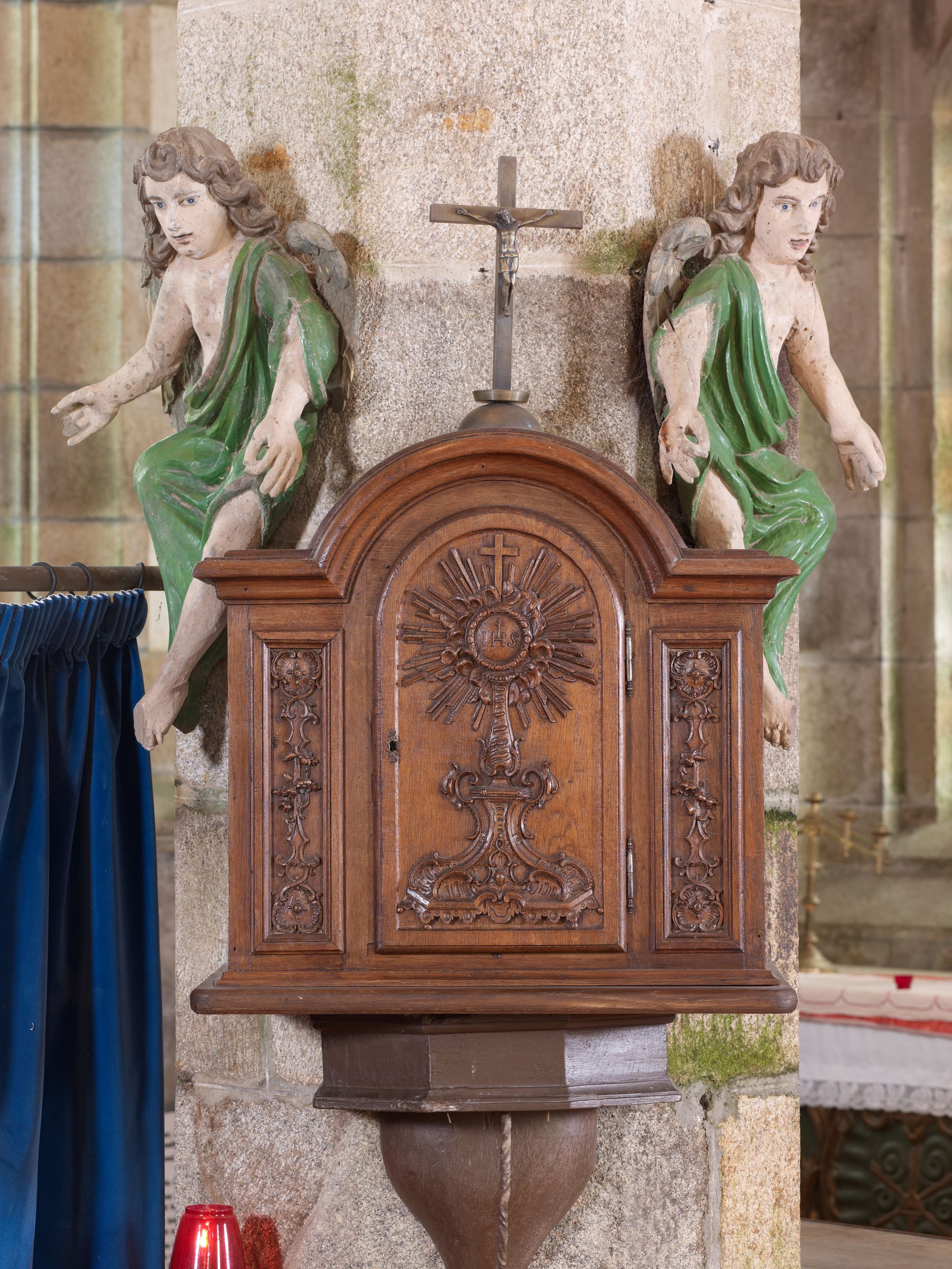 Tonquédec, le bourg : église paroissiale Saint-Pierre, vue intérieure, statue d'angesImmatriculation