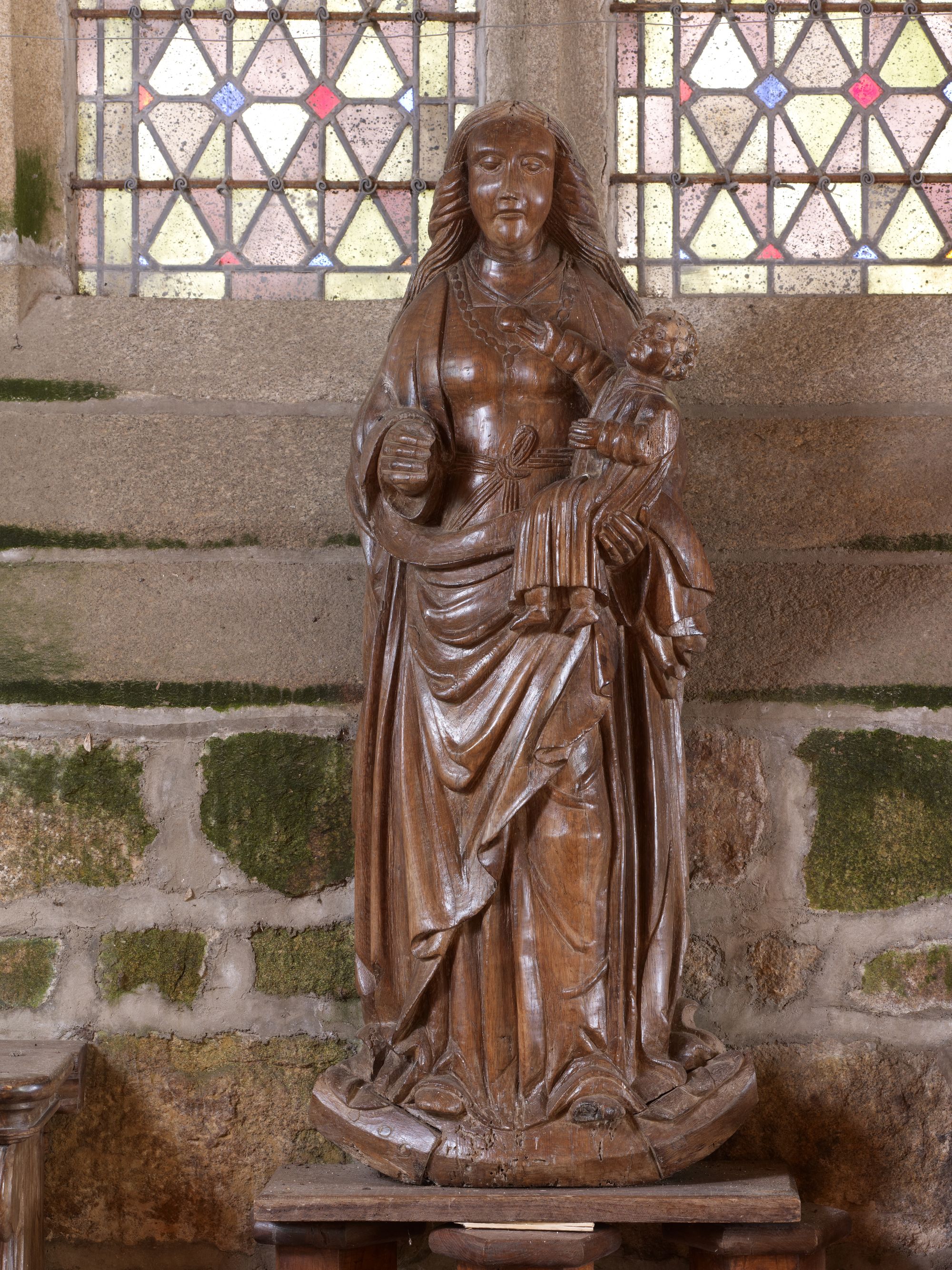 Tonquédec, le bourg : église paroissiale Saint-Pierre, vue intérieure, statue de la Vierge à l'enfantImmatriculation
